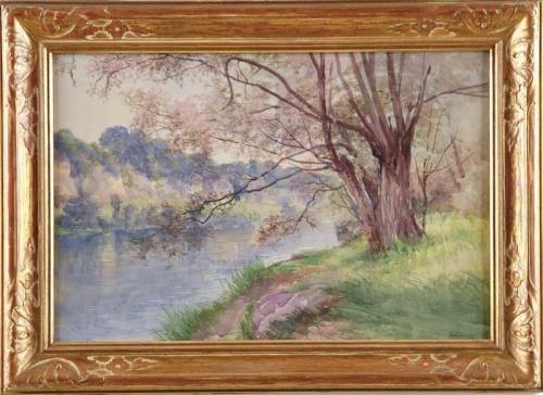 JULES FRANCOIS ARCHILLE AMBROISE (French, 20th Century) RIVER LANDSCAPE. Fine watercolor summer scene shows a large tree lined grass covered bank next to a blue river with high rock distant bank. Signed lower right “Ambroise 1909”. Housed in a fine carved wood gilt frame. SIGHT SIZE: 13-3/4” x 20-3/4”. CONDITION: Very good. 9-26145