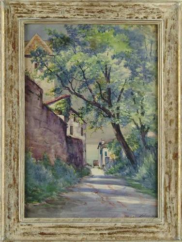 JULES FRANCOIS ARCHILLE AMBROISE (French, 20th Century) PATH TO THE SEA. Watercolor scene shows a path between buildings leading to open ocean. Signed lower right “Ambroise 1909”. Housed in a partial gilt molded wood frame. SIGHT SIZE: 21” x 14-1/2”. CONDITION: Very good. 9-26718