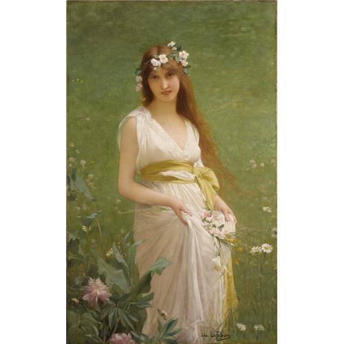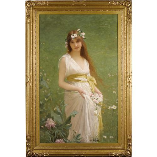 <B>JULES-JOSEPH LEFEBVRE</B></I> (French 1834-1911)<BR><I>Springtime</B></I><BR>Oil on canvas<BR>55-1/2 x 34 inches (140.6 x 86.4 cm)<BR>Signed lower right: <I>Jules Lefebvre</B></I><BR><BR>While elegant young women remained Lefebvre's preferred subject throughout his long and distinguished career, his beautiful sitters remained sensitive to the dominant esthetic tastes of the day. In the late 1880s and 1890s, as the Symbolist and Classicist mode of artists such as Puvis de Chavannes or Gustave Moreau supplanted the Naturalist or exotic tendencies of earlier decades, Lefebvre's work shifted accordingly. The present work, most likely of this period, presents an allegorical figure of <I>Springtime</B></I> crowned with a wreath of pale blossoms and carrying fresh stems in the folds of her classical gown. Despite the idealized, symbolist subject, Lefebvre's commitment to painting from life is evident in the very specific, crisply painted flowers and foliage and in the translucent tones of flesh and fabric.<BR><BR>Jules-Joseph Lefebvre is best known as a romantic allegorical painter who specialized in genre scenes, portraits, and nudes. His father, a baker, encouraged his sons artistic career and sent him to Paris at age sixteen. There he studied with Léon Cogniet and entered the Ecole des Beaux-Arts in 1852. He competed for the Prix de Rome, winning a second place in 1859 and first place in 1861 with his painting of <I>The Death of Priam.</B></I> While living in Rome he painted his first nude, a Bather, which was sent to Paris in 1863. During his stay in Italy he also painted many works with ancient subject matter, investing them with an elegant or amusing quality. When he returned to Paris, Lefebvre became disenchanted with the academic focus on working from memory and sought to paint directly from life. The result was a series of statuesque women, both nudes and draped, which passed from his studio under the guises of such characters as Pandora, Diana, Sappho, Mary Magdalene and Ophelia. <I>Ophelia,</B></I> a similar work of 1890, is in the permanent collection of the Springfield Museum of Fine Arts, Springfield, Massachusetts.<BR><BR>Lefebvre made a distinguished career as a painter of women. One reviewer wrote in 1881, <BR><BR><I>It is sufficient to just mention his name in order to immediately evoke the memory and the image of the thousand adorable creature of which he is the father…. An unusually skilled draughtsman, Jules Lefebvre better than anyone else caresses, with a brush both delicate and sure, the undulating contour of the feminine form.</B></I><BR><BR>Lefebvre won medals at the Salons of 1865, 1868, and 1870. After the last, where he exhibited his famous nude <I>Truth,</B></I> now in the Musée d'Orsay, he was made a Chevalier of the Legion of Honor. His success only grew and he won a first class medal at the Exposition Universelle of 1878 and the grand prize in 1889. In 1891 he became a member of the Institute and in 1898 was made a Commander of the Legion of Honor.<BR><BR><BR><BR><b>Shipping:</b> Requires 3rd Party Shipping (<a target="_blank" href="http://www.heritageauctions.com/common/shipping.php">view shipping information</a>)