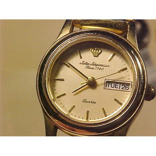 Excellent Jules Jurgenson Water Resistant Day and Date Gold tone Watch. It comes on a stretch linked band. The dial is 3/4" in diameter.