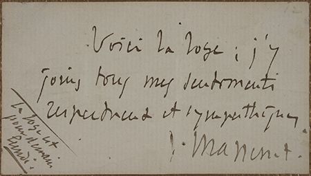 (1842 - 1912) French composer of operas, concertos and ballets whose works include Manon, Sapho, and Don Quichotte. A.D.S. 1p. 12mo., [n.p., n.d.], in French, a complimentary pass for two seats in the loge of a theater, undoubtedly given to friends, signed at bottom. Simply matted and framed.
