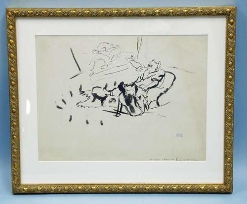 JULES PASCIN (1885-1930) "The Lesson". China ink study on beige paper. Signed, and with Atelier stamp, also titled and date January 1924, lower right. 12" x 16". In gilt frame. With certificate of expertise from Frode Krohg. Ref. Benezit, vol. 6, page 534. 5000-6000