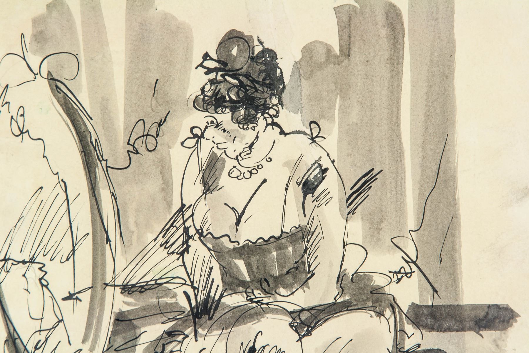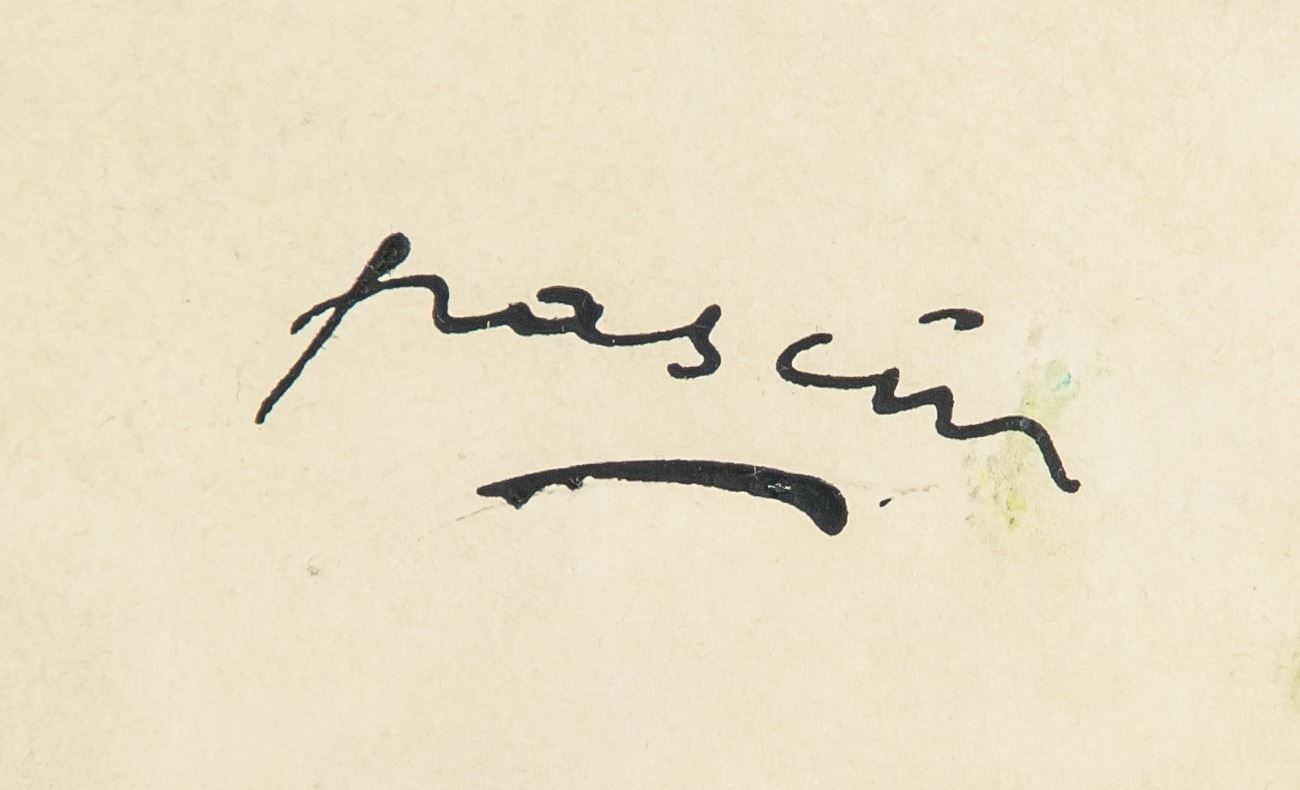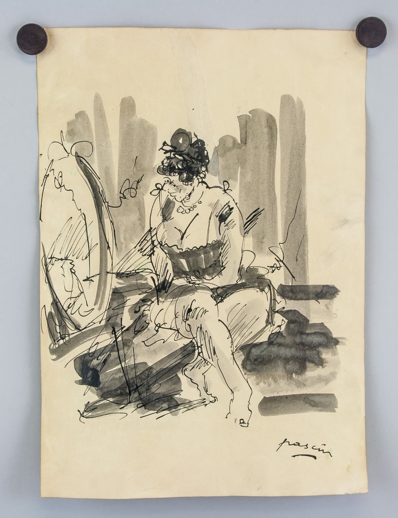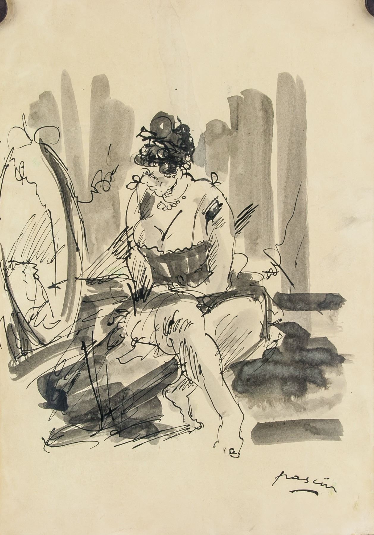 Ink on paper. Featuring a woman looking into a mirror. Signed and attr. Jules Pascin (Bulgarian-American, 1885-1930). Signature on the lower bottom right edge. 11.5 x 8.25 in. (29.2 x 30 cm). Jules Pascin was a Bulgarian-born French Expressionist painter. Known under the pseudonym of the "Prince of Montparnasse" Pascin mainly painted women, often nude or in stages of undress, in a fleeting, gestural aesthetic akin to the movements of Fauvism or Cubism. Born in Vidin, Bulgaria on March 31, 1885 to an affluent Sephardic Jewish family, he was educated in Austria and Germany before moving to Paris in 1905. There, he quickly found artistic popularity and became associated with the Modernist movement. He regularly exhibited prints and drawings in various important Parisian salons, including the Salon des Independants and satellite exhibitions of the Berlin Secession. Despite achieving success in Europe and North America - Pascin became a naturalized US citizen with the help of Alfred Stieglitz in 1920 - he never achieved the critical discourse he craved. Eventually succumbing to depression and alcoholism, he took his own life on the eve of an important solo show on June 5, 1930 at the age of 45. Pascin's work was appreciated throughout his life and beyond, marked by such achievements as his inclusion in the notorious 1913 Armory Show in New York. Today, his work can be found in the collections of The Metropolitan Museum of Art in New York, the Louvre in Paris, the Art Institute of Chicago, and others. PROVENANCE: Private European estate