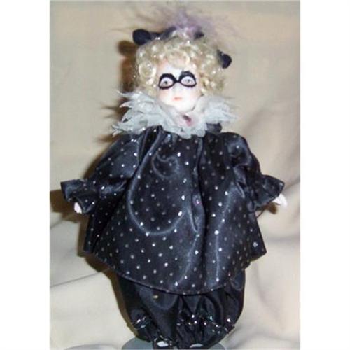 This auction is for a rare Julia Rueger doll by Schmid Doll House 1987...Julia is a self-taught artist and has been making doll since 1981 and this is one of her earlier dolls...Julia Rueger is one of the premier doll artist in this country...Her dolls are highly sought after and the older ones are becoming harder and harder to fine...Julia believes that you can see the beauty of a child's soull through faces, because it reveals their emotions...She'll spend hours looking through magazines and catalogs trying to find a real child to inspire her...she believes that clothing is criticial to creating a beautiful doll...She uses bright colors and vivid patterns...This doll do not have a box and was found at an estate sale..She is beautiful...She is 8 1/2" tall 9 1/2" including the hat...Her face , especially her eyes are so real and expressive... She's wearing a black bell shape top in black satin and silver poka dots and the sleeves gather at the wrist and her label in sewn in the back of top...The is a white net ruffled collar with a pink rhinestone in the middle...The pants are also black satin with a shrimming braid that gives off many colors when the light hit it...Her shoes are paint black ...Her hair is blond and she has a black painted mask over her eyes...Her hat looks velvet with a feather and pink rhinestone...This doll has no damage , chips, or cracks...She is also from a smoke free home...Contact me for further questions...Thank you for shopping in my Shoppe...