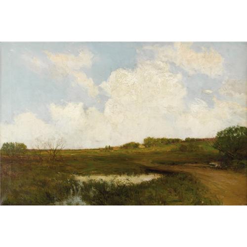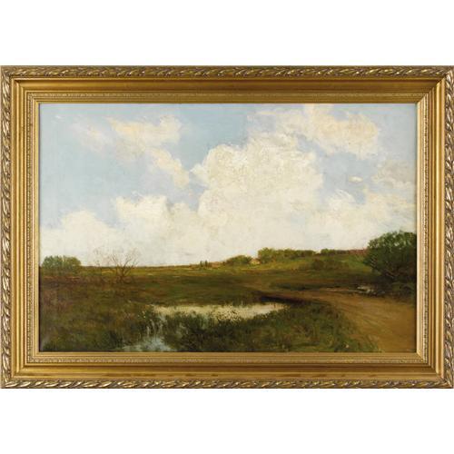 <B>JULIAN ONDERDONK (1882-1922)</B></I><BR><I>The Road Through the Meadow,</B></I> 1909<BR>Oil on canvas<BR>20in. x 30in.<BR>Signed lower left<BR>Signed, dated, and titled verso<BR><BR>This painting is composed so that nearly sixty percent of the painting is sky and clouds. The clouds are masterfully rendered. A mauve underpainting provides shadow. Onderdonk has purposefully left the paint thin around the cloud edges to let the underpainting show through. The rich thick impasto and lively brushstrokes of the central and surrounding clouds are hard to capture by photograph, but in person these clouds come alive.<BR><BR>The foreground is in shadow, but the midground is lit with sunlight. Both the road and the creek serve as compositional devices to direct the eye to the farm house and the red roofed barn. The water in the creek reflects the whites and blues of the clouds and sky.<BR><BR>The painting is in a remarkable state of preservation -- original canvas with no losses, no inpainting, no lining, no cracking, and impasto completely intact.<BR><BR> <B>Condition Report:</B> Excellent condition. Period frame in excellent condition.<BR><BR><b>Shipping:</b> Requires 3rd Party Shipping (<a target="_blank" href="http://www.heritageauctions.com/common/shipping.php">view shipping information</a>)