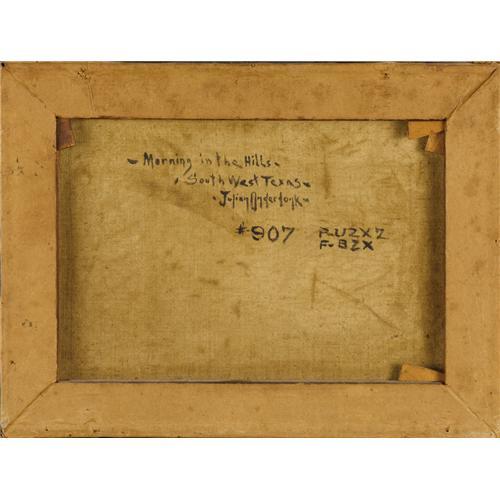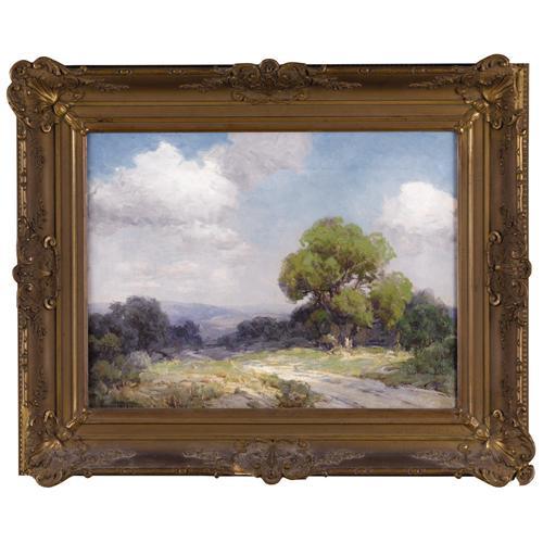 <B>JULIAN ONDERDONK (1882-1922)</B></I><BR><I>Morning in the Hills Southwest Texas</B></I><BR>Oil on canvas<BR>12in. x 16in.<BR>Signed lower left<BR>Signed and titled verso<BR><BR>Roads are as emblematic of Texas as the bluebonnet, the blooming prickly pear, the century plant, or the Longhorn steer. After all, Texas exists because of a road, the Camino Real, which ran from Mexico through San Antonio into Louisiana. Texas was the terminus of the road, literally the end of the road in the Spanish Colonial Empire.<BR><BR>The true genius of Julian Onderdonk is that he takes what is emblematic of Texas and makes it monumental and beautiful. With his bluebonnet paintings, the dry dirty land springs forth with a blue carpet of color, or he takes the scourge of a plant, the prickly pear cactus, and renders the blooms so beautifully we are reminded there is a God.<BR><BR>In this painting, the rutted caliche road is as emblematic of Texas as bluebonnets or blooming prickly pear cactus. As the road winds through the hills, alternating areas of shadow and bright Texas light mark the land. The clouds and atmospheric effects of moisture are exceptionally rendered. The haze in the distant hills provide a richness of color and a sense of depth.<BR><BR>The painting is in its original frame and is in a remarkable state of preservation without losses, inpainting, or lining of the canvas.<BR><BR> <B>Condition Report:</B> Excellent condition with no restorations or losses. Original canvas without lining. Pristine! Period frame in excellent condition.<BR><BR><b>Shipping:</b> Requires 3rd Party Shipping (<a target="_blank" href="http://www.heritageauctions.com/common/shipping.php">view shipping information</a>)