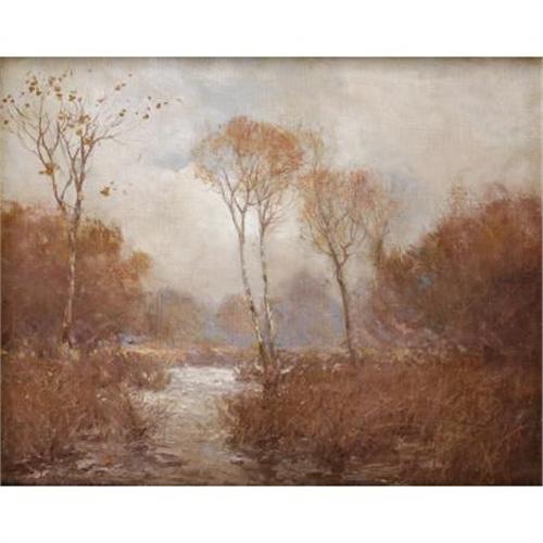 <B>JULIAN ONDERDONK (American, 1882-1922)</B></I><BR><I>October Landscape</B></I><BR>Oil on canvas<BR>24 x 30 inches (61.0 x 76.2 cm)<BR>Signed lower right: <I>Julian Onderdonk </B></I><BR> <BR>Julian Onderdonk was influenced by three landscape traditions: the Barbizon School, the Tonalists, and the American Impressionists. This commanding painting is a synthesis of Tonalism and Impressionism.<BR><BR>The heavier impasto describing reflections in the water and the surrounding undergrowth is characteristically impressionistic and is similar to foreground textures achieved by William Merritt Chase in his celebrated Shinnecock landscapes. <BR><BR><b>Shipping:</b> Requires 3rd Party Shipping (<a target="_blank" href="http://www.heritageauctions.com/common/shipping.php">view shipping information</a>)