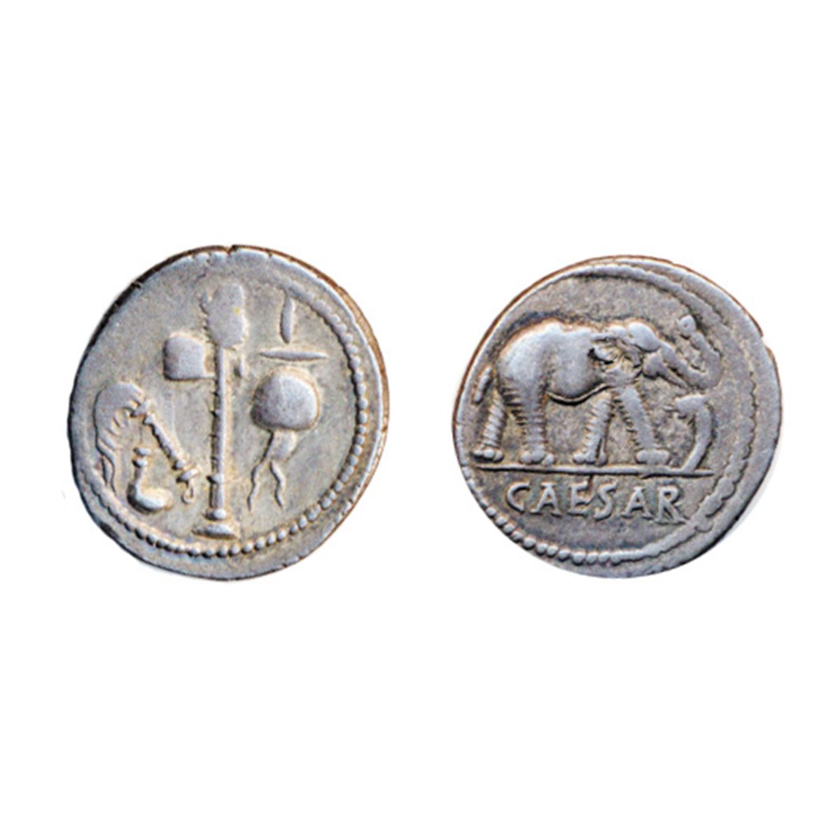 JULIUS CAESAR, d. 44 BC. Silver Denarius struck at a mint moving with Caesar, 49-48 BC. Obv: Elephant right, trampling snake. Rev: Pontifical emblems. Cr. 443/1; Syd. 1006. Very Fine.