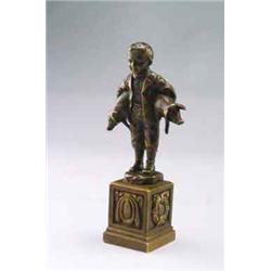 JULIUS SCHMIDT-FELLING, 1835 - 1920 Figur, Bronze, patiniert. Auf quaderförmigem Sockel mit reliefiertem Girlanden- und Kranzdekor ein stehender Knabe, in beiden Armen ein Schwein haltend. H.: 15 cm. Rückseitig bez.: Schmidt-Felling. Lit.: Catley, B., Art-Deco- und Jugendstilfiguren, Suffolk 1981, Abb. S. 291 (zu Arbeiten).