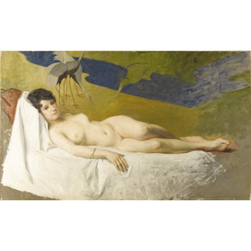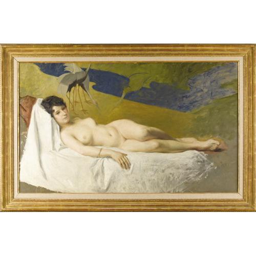 <B>JULIUS STEWART</B></I> (American 1855-1919)<BR><I>Reclining Nude by an Oriental Screen,</B></I> circa 1900<BR>Oil on canvas<BR>28-1/2 x 47-3/4 inches (72.4 x 121.3 cm)<BR><BR>Stewart was born in Philadelphia, but moved permanently to Paris with his family at the age of 10. Through his father, William Hood Stewart, a wealthy patron of Spanish and French artists, he became acquainted with leading figures in the art world. His father's collection was extremely strong in contemporary Spanish art, particularly the work of Mariano Fortuny, Eduardo Zamacrois, and Raimundo de Madrazo. Stewart studied at various times with Zamacrois, Madrazo and Jean-Léon Gérôme, and inspired by their example developed a colorful academic realist style. His oeuvre also includes nudes, genre scenes, and views of Venice. Stewart exhibited at the Paris Salon and at major international expositions, where he won many awards and prizes. Stewart received the French Legion of Honor in 1895. After 1900, Stewart rarely exhibited his art.<BR><BR> Reclining Nude By an Oriental Screen dates from about 1900-at roughly the end of the decade he devoted to painting the nude in indoor as well as outdoor settings. He generally preferred creating compositions which focus upon a single woman in an elegant interior. The woman portrayed here appears to be Juliette V., who was one of Stewart's favorite models as well as his mistress (<I>Julius LeBlanc Stewart: American Painter of the Belle Époque</B></I> New York: Vance Jordan Fine Art Inc., 1998 , p. 59).<BR><BR> Stewart's approach to the nude remained formal and academic. Decorously posed before decorative backdrops, they always appear to be in perfect harmony with their surroundings. According to Bailey Van Hook, Stewart 'often exhibited his nudes as studies and they have the character of academes in their obviously posed positions' ('The Genre Paintings of Julius L. Stewart: A Myriad of Influences,' unpublished paper, for Dr. H. Barbara Weinberg, City University Graduate Center, 1981, p. 28).<BR><BR><b>Shipping:</b> Requires 3rd Party Shipping (<a target="_blank" href="http://www.heritageauctions.com/common/shipping.php">view shipping information</a>) <BR><BR><B>Important notice:<