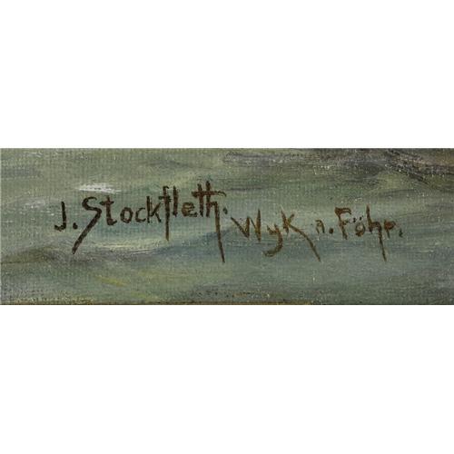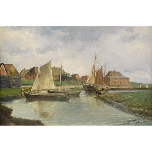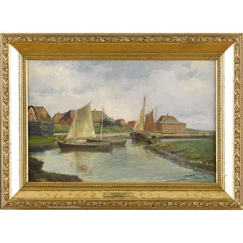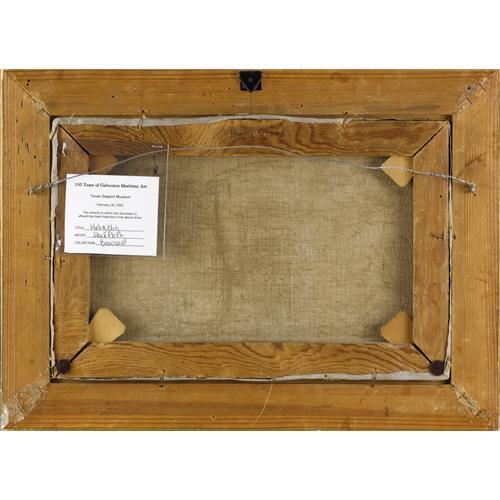 <B>JULIUS STOCKFLETH (1857-1935)</B></I><BR><I>Halig Olig (Sea Harbor),</B></I> 1919<BR>Oil on linen<BR>11 1/4in. x 17in.<BR>Signed lower right<BR><BR>Julius Stockfleth immigrated with his parents to the United States in 1883, and settled in Galveston, Texas, two years later. For the two decades he was in Texas, Stockfleth produced a valuable record of early Galveston. His most important contribution were his portraits of ships passing through Texas and his record of the Galveston hurricane of 1900.<BR><BR>His paintings are naive in style, but possess bright and clear detail. In 1907, he returned to Germany where he lived out his life. This painting dated 1919, is of his hometown birthplace, Wyk Fohr, on the German coast of the North Sea, and was exhibited at the Texas Seaport Museum in February, 1005.<BR><BR>Exhibited:<BR>Texas Seaport Museum, 150 Years of Galveston Maritime Art, February 26, 2005<BR><BR> <B>Condition Report:</B> Excellent condition. Period frame in excellent condition.<BR><BR><b>Shipping:</b> Requires 3rd Party Shipping (<a target="_blank" href="http://www.heritageauctions.com/common/shipping.php">view shipping information</a>)