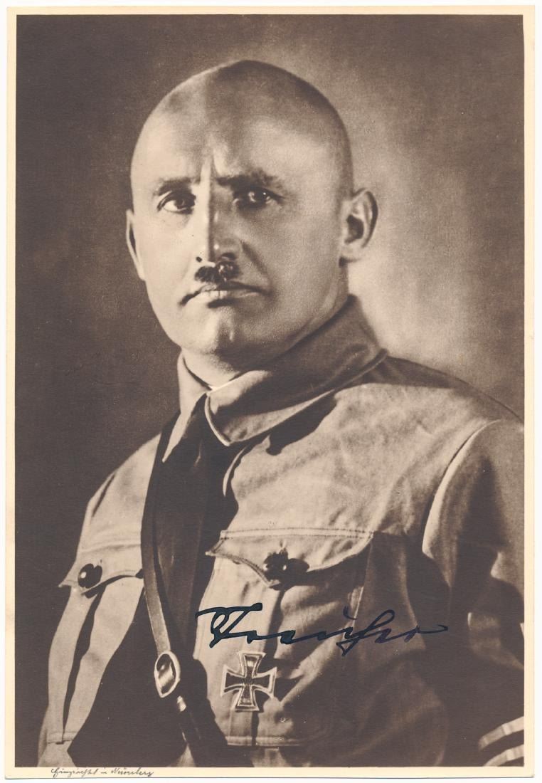 6 1/4" x 9 1/4" sepia, a chest-up pose in brown shirt uniform very boldly signed in black ink, also signed in the white bottom margin in pencil by the Nuremberg photographer.