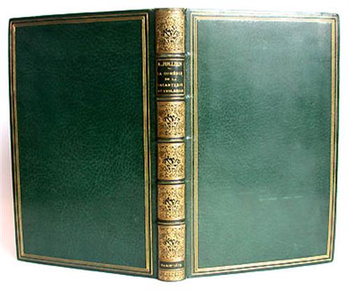 JULLIEN, Adolphe.- La Comédie et la Galanterie au XVIIIe siècle. Au théâtre, dans le monde, en prison. (Eaux-fortes par M. L. Rouveyre & de Malval). Paris, Édouard Rouveyere, 1879. In-8°. Relié par Pouillet : plein maroquin vert, triple filet doré sur les plats, dos à nerfs et caissons entièrement fleuronnés dorés, filet sur les coupes et fine dentelle dorée sur les remplis, tranches dorées, gardes et doubles gardes de papier marbré, couv. et témoins de gouttière cons. (pet. griffe sur le plat sup., coupes partiellement frottées).