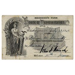 John F. Kennedy signed Congressional Member's Pass from his tenure as U.S. Congressman, admitting a Mr. William H. Stewart to the Visitor's ...