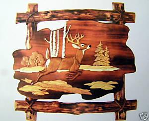 "JUMPING DEER" - 24X24 - FRAMED - HAND CARVED - HAND STAINED - MADE OF MANY DIFFERENT HIGH QUALITY WOODS - WELL MAINTAINED - QUALITY