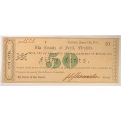 1862 FIFTY CENT COUNTY OF SCOTT, VA NOTE