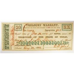 1864 $20 TEXAS TREASURY WARRANT NOTE