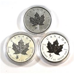 RCM Issue: 2013 25th Anniversary, 2015 & 2016 Canada 1oz .9999 Fine Silver Maple Leafs. Coins are toned or spotted (Tax Exempt). 3pcs