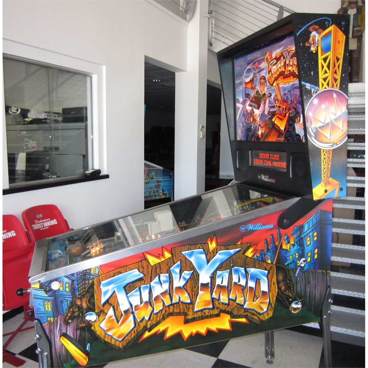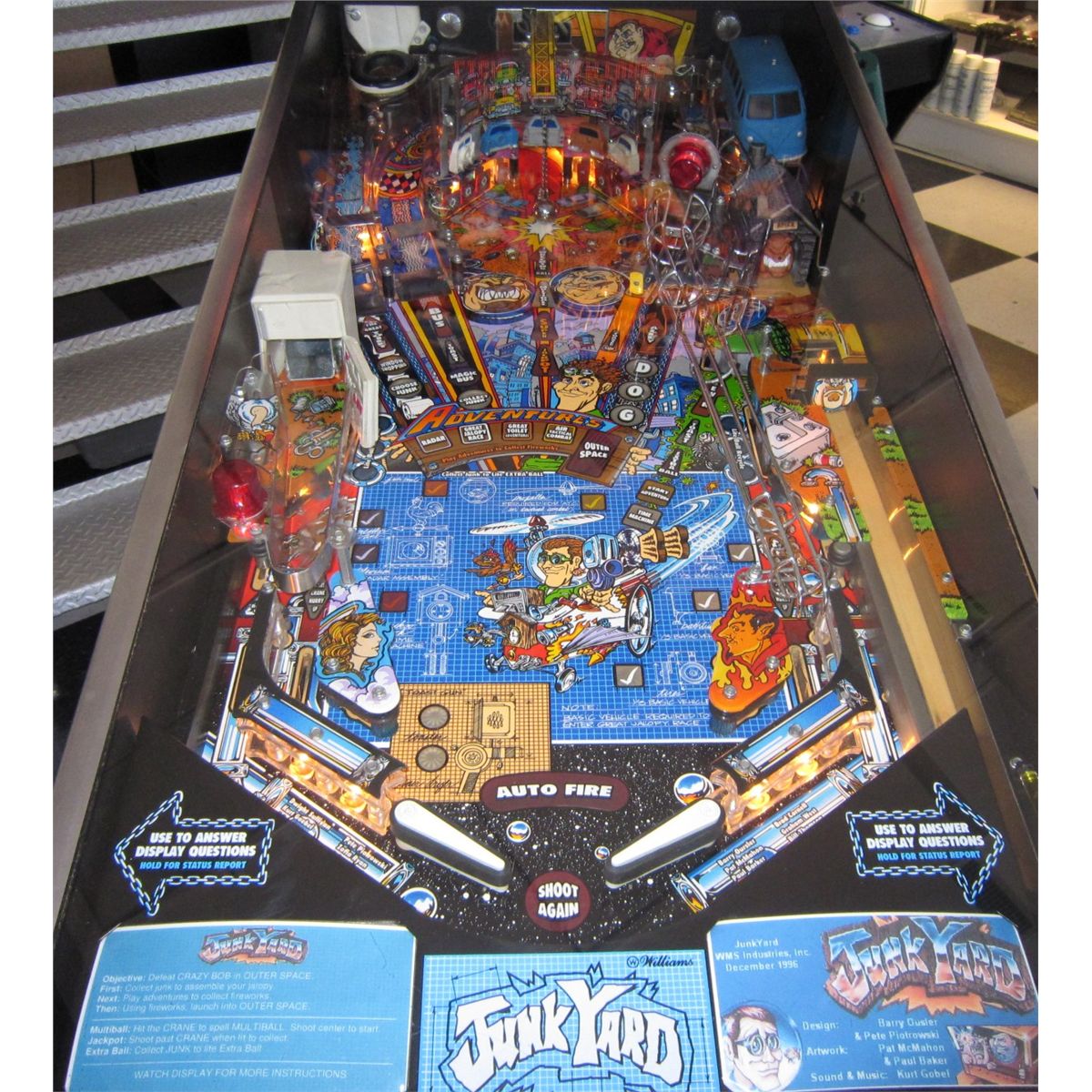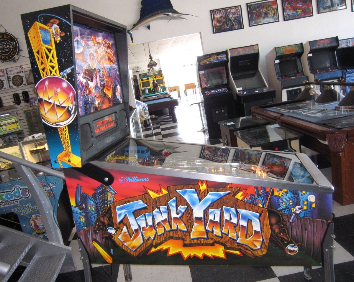 Junk Yard tells the story of a young inventor TRAPPED by Crazy Bob! Our hero decides the only way to escape is to build a FLYING JALOPY. It is in excellent condition. It plays great. The playfield has been cleaned and polished. Worn rubber and burnt bulbs have been replaced and all functions checked for proper operation by a pinball technician.