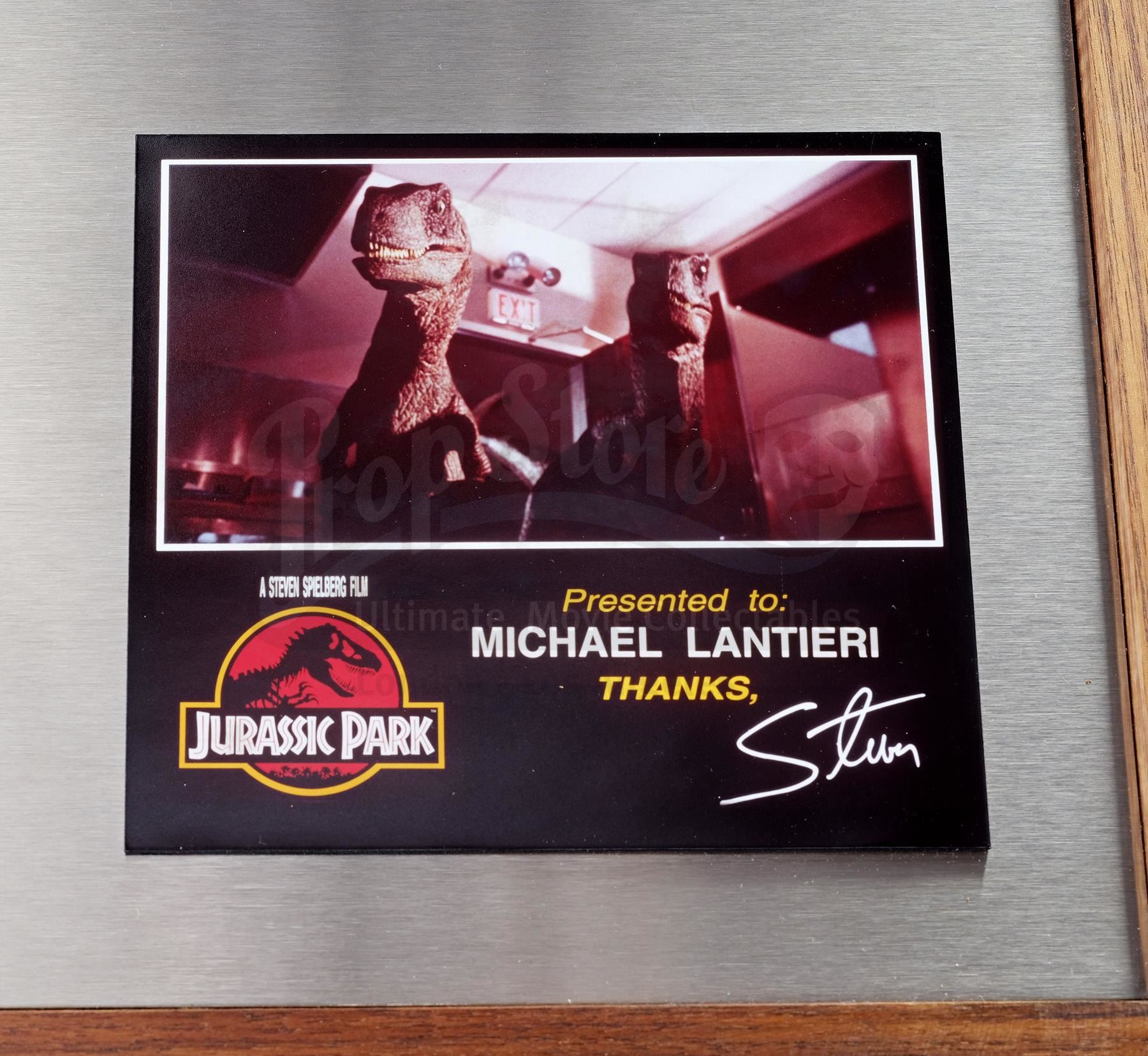 Only a very small number of these crew gifts were made for key crew members, and this one was gifted to physical effects artist Michael Lantieri, who also shared in the Visual Effects Academy Award for the film. It is mounted with metal screws in a clear acrylic case with a reflective metal and wooden base. A plaque inside the case features the film's logo and reads, "Presented to: Michael Lantieri Thanks" alongside an engraving of Spielberg's signature. The case exhibits minor wear from age. Dimensions: 25.5 cm x 93 cm x 45.75 cm (10" x 36 1/2" x 18")