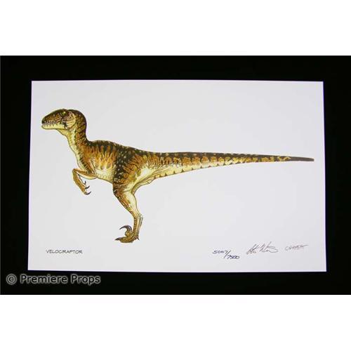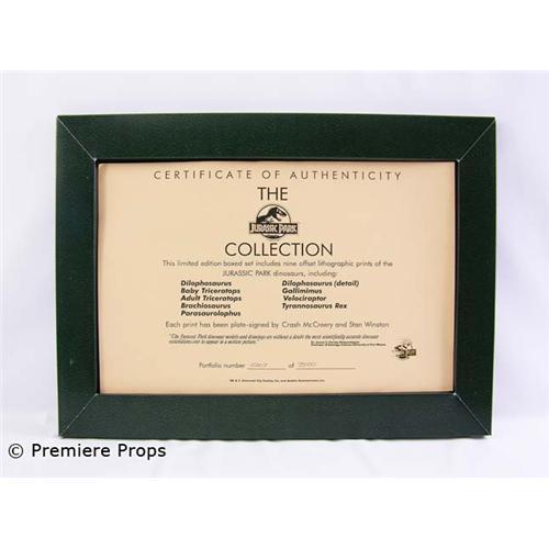 Jurassic Park limited edition boxed set of nine offset lithographic prints of the Jurassic Park dinosaurs, including: Dilophosaurus, Baby Triceratops, Adult Triceratops, Brachiosaurus, Parasaurolophus, Dilophosaurus (detail), Gallimimus, Velociraptor, and Tyrannosuarus Rex. Each print has been plate signed by Crash McCreery and Stan Winston. 5007 of 7500 (Prints are ~ 17" x 11" Case is ~ 21.5" x 15.5" (JP2000)