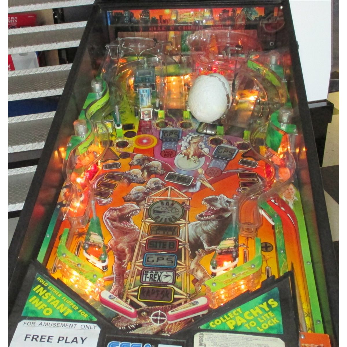 One of the most entertaining Sega pins, this game is great for families. Features a giant opening egg that hatches a baby T-Rex. Great sounds including custom speech by Jeff Goldblum. The playfield is in very nice condition It plays great and it has been shopped. The playfield has been cleaned and polished. Worn rubber and burnt bulbs have been replaced. Keys and locks are included.