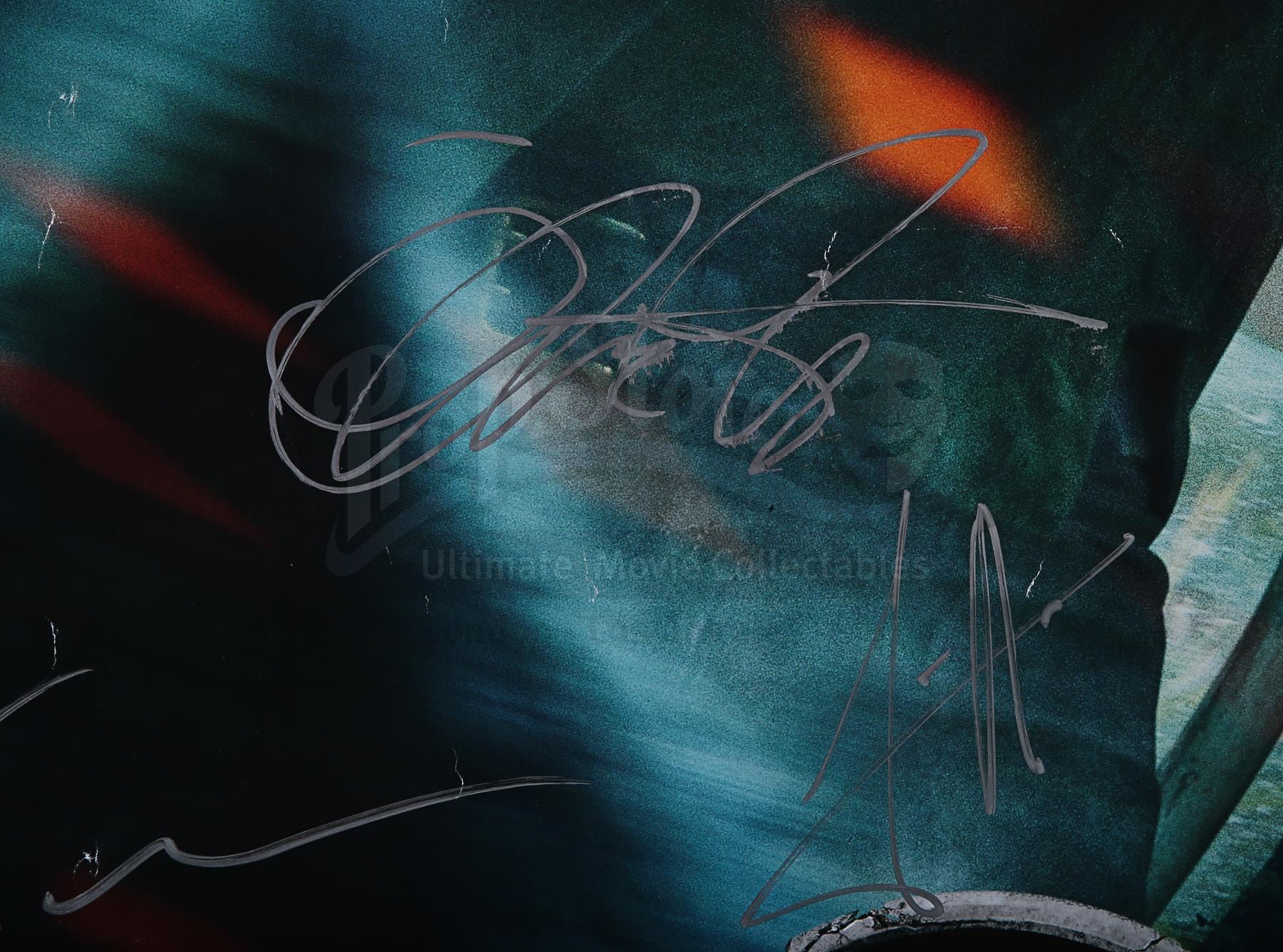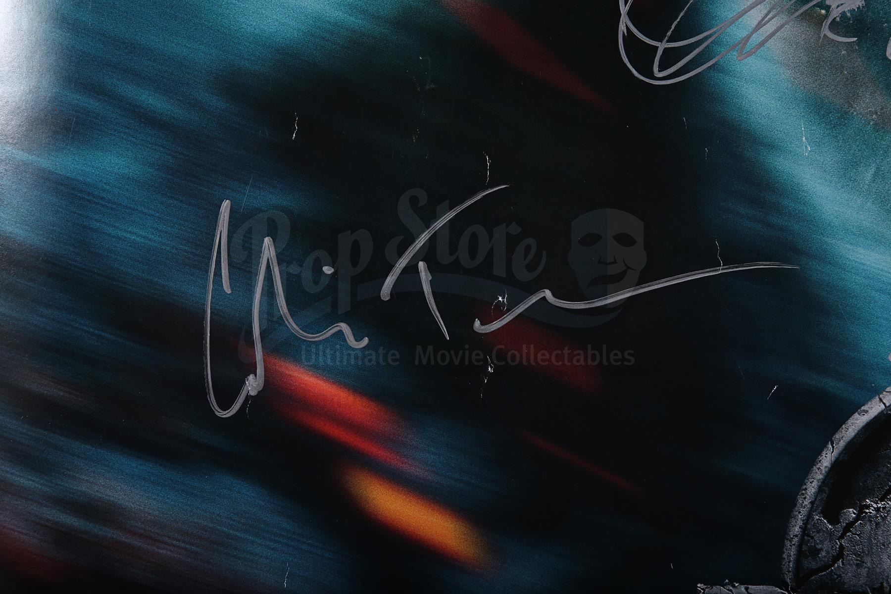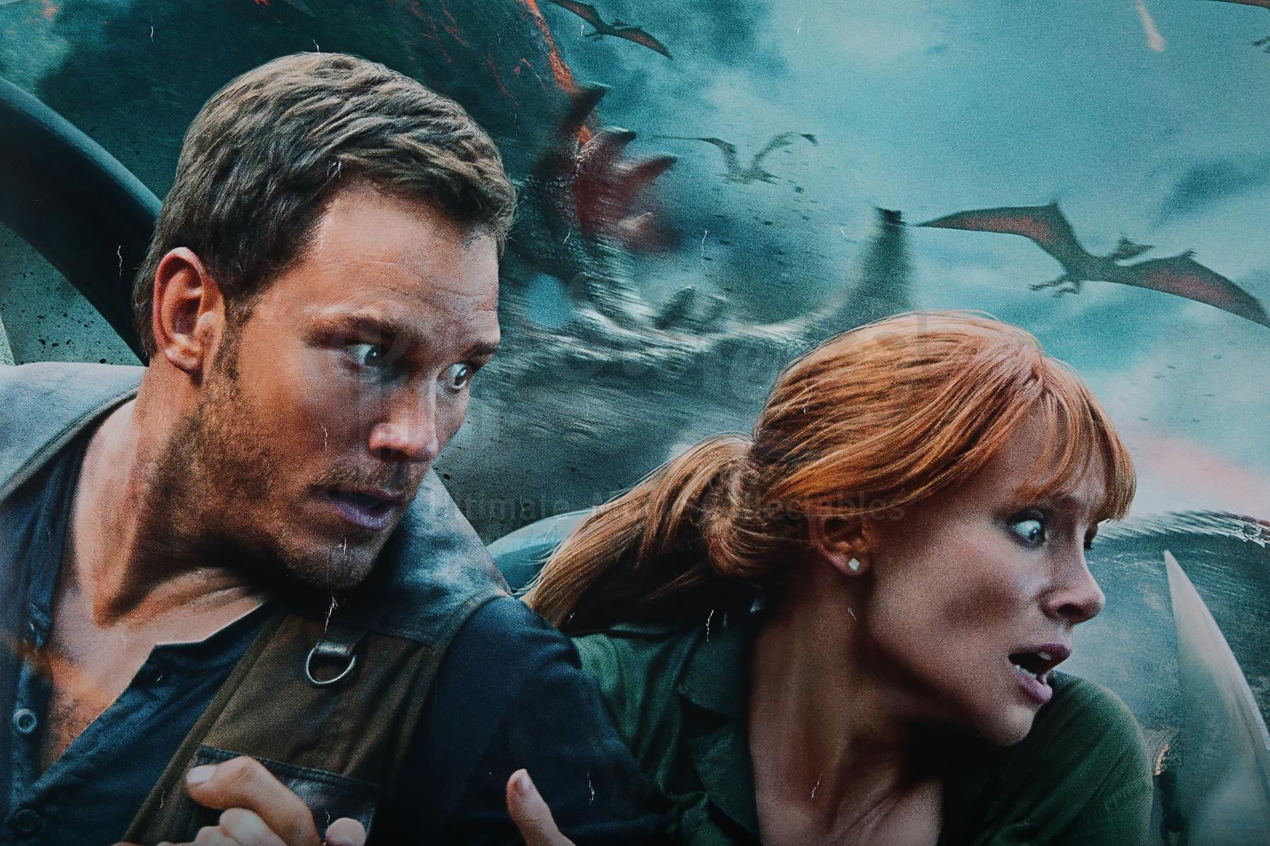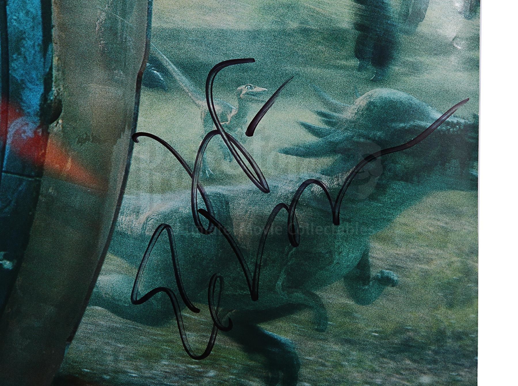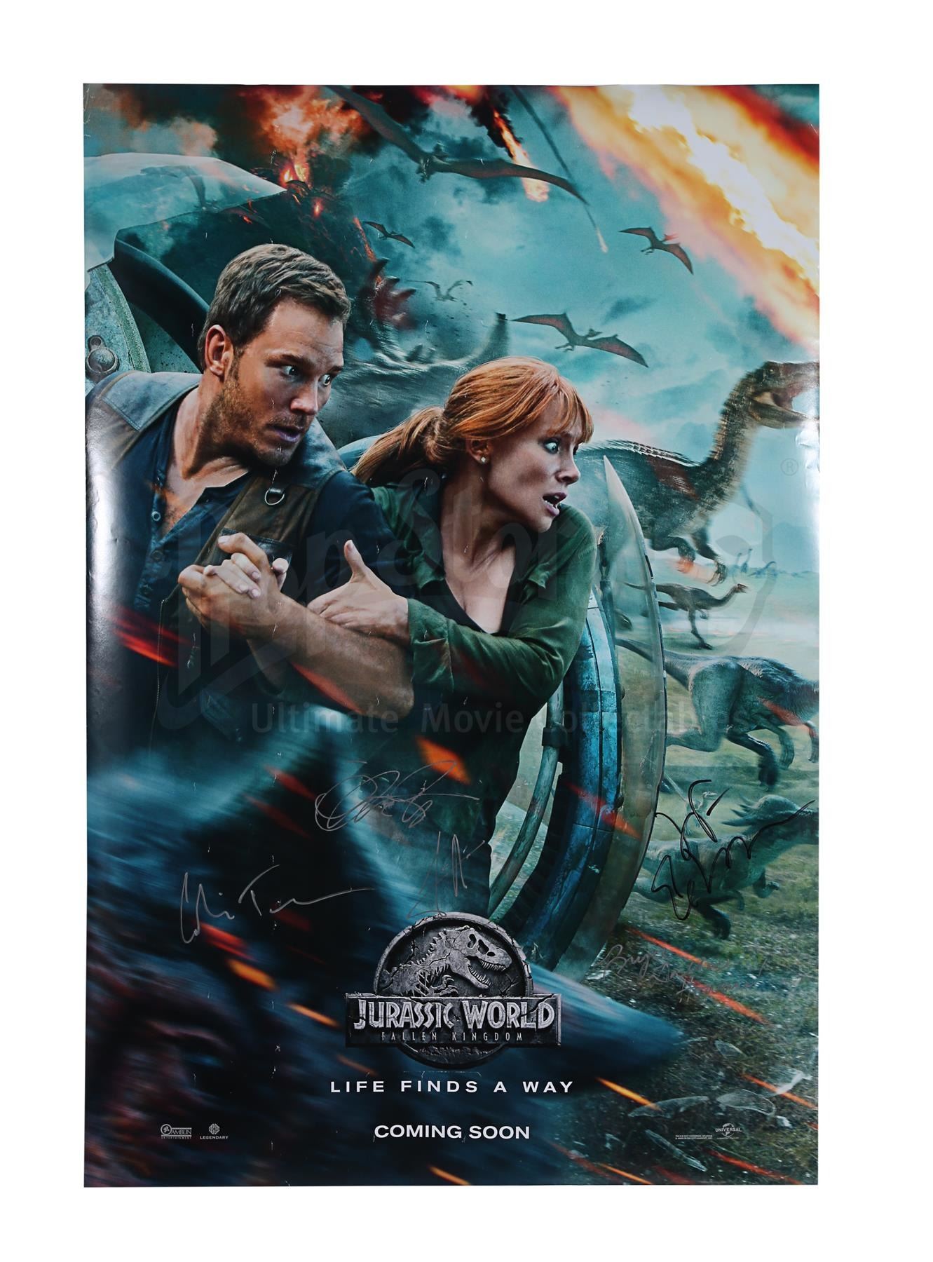 A cast-and-crew autographed promotional poster for J.A. Bayona's action-adventure sequel Jurassic World: Fallen Kingdom. The one-sheet poster features an image of Owen (Chris Pratt), Claire (Bryce Dallas Howard) and multiple species of dinosaur running from an erupting volcano. The poster is autographed in black and silver-coloured marker by Chris Pratt, Bryce Dallas Howard, Jeff Goldblum, director J.A. Bayona and executive producer/co-writer Colin Trevorrow. The silver-coloured ink has bled slightly in places and the lot exhibits signs of wear, including a small rip on the bottom edge and minor creases, notably on the top-left corner. Dimensions: 101 cm x 68.5 cm (39 3/4" x 27")