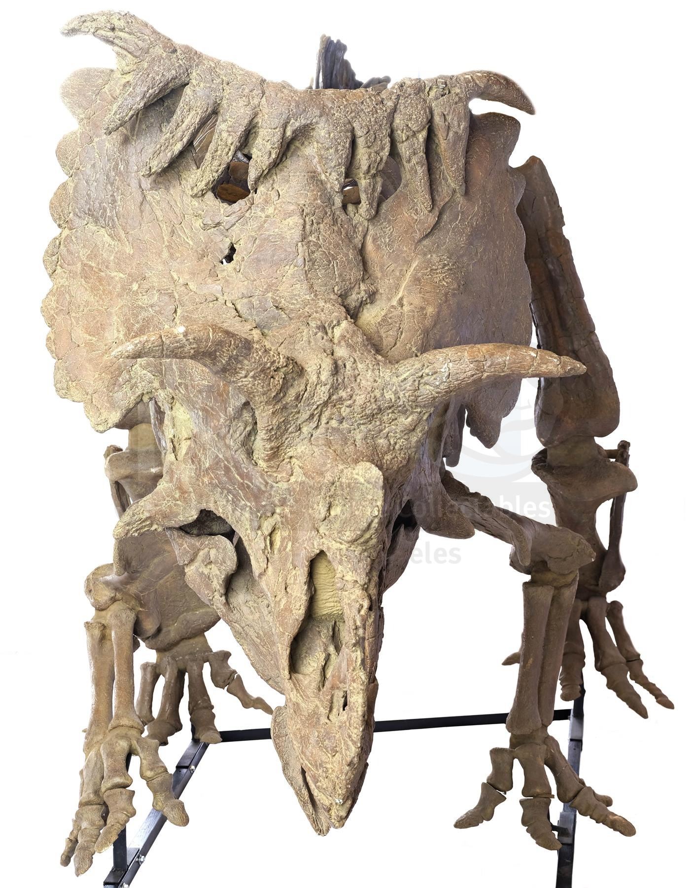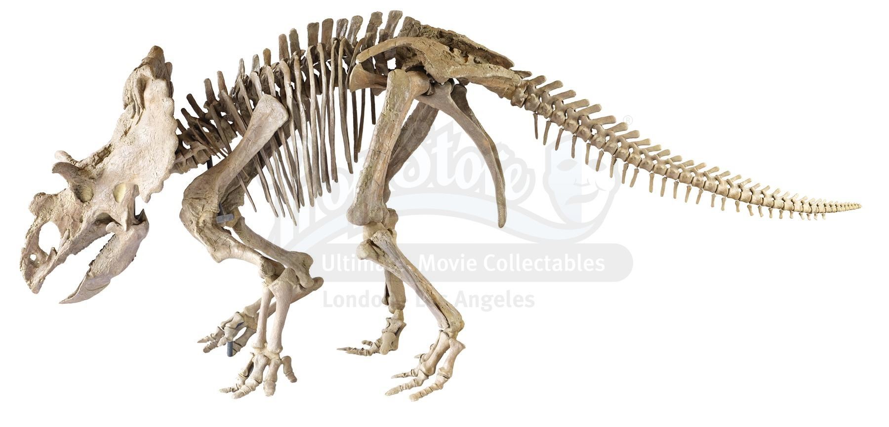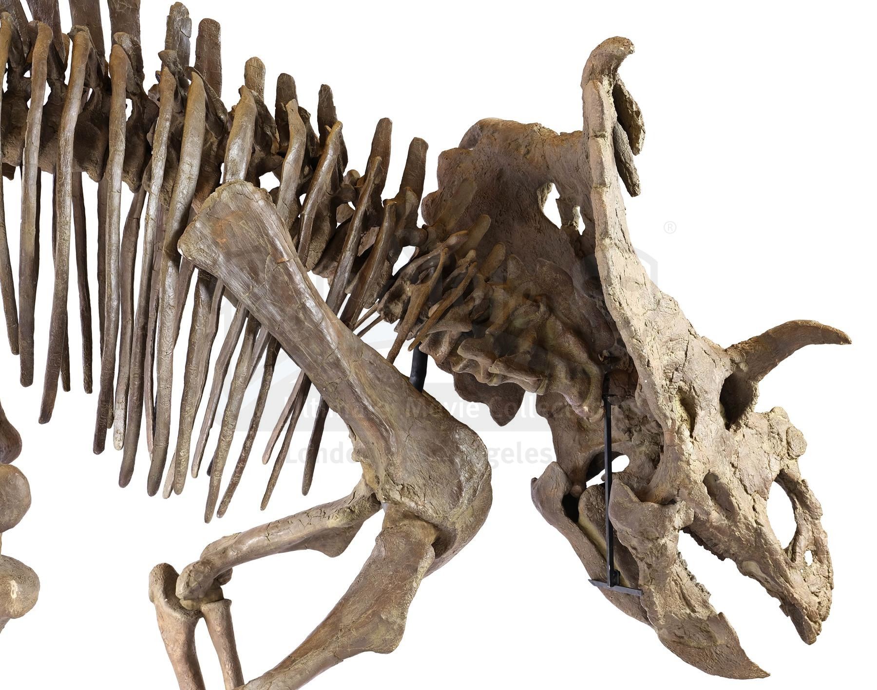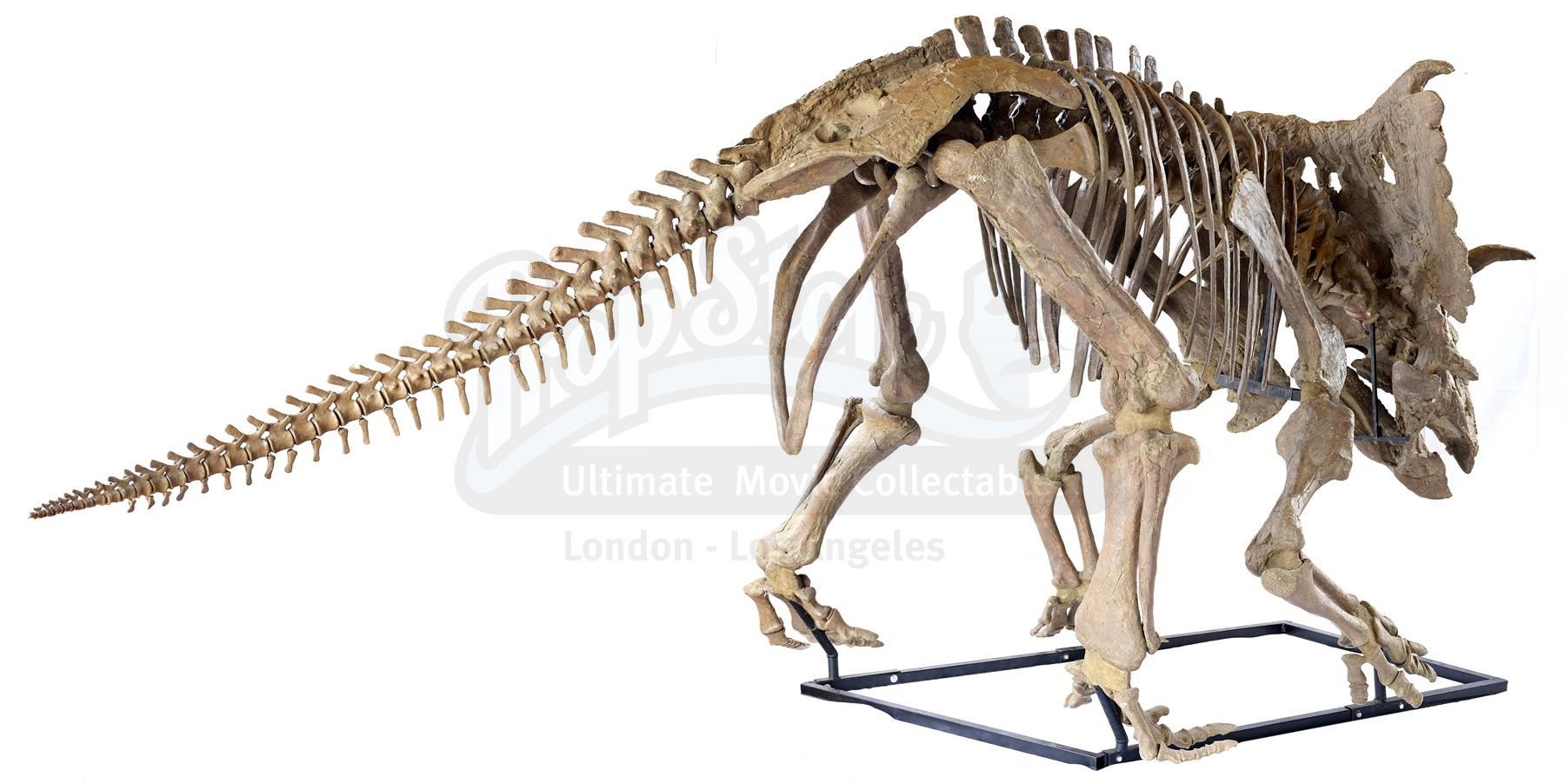 A diorama room 15-foot kosmoceratops skeleton from J.A. Bayona's action-adventure sequel Jurassic World: Fallen Kingdom. Owen Grady (Chris Pratt), Claire Dearing (Bryce Dallas Howard) and Maisie Lockwood (Isabella Sermon) used the dinosaur skeletons in the Lockwood Library as cover to help them evade the Indoraptor hunting them. This particular skeleton is prominently seen by the main entrance of the library.
