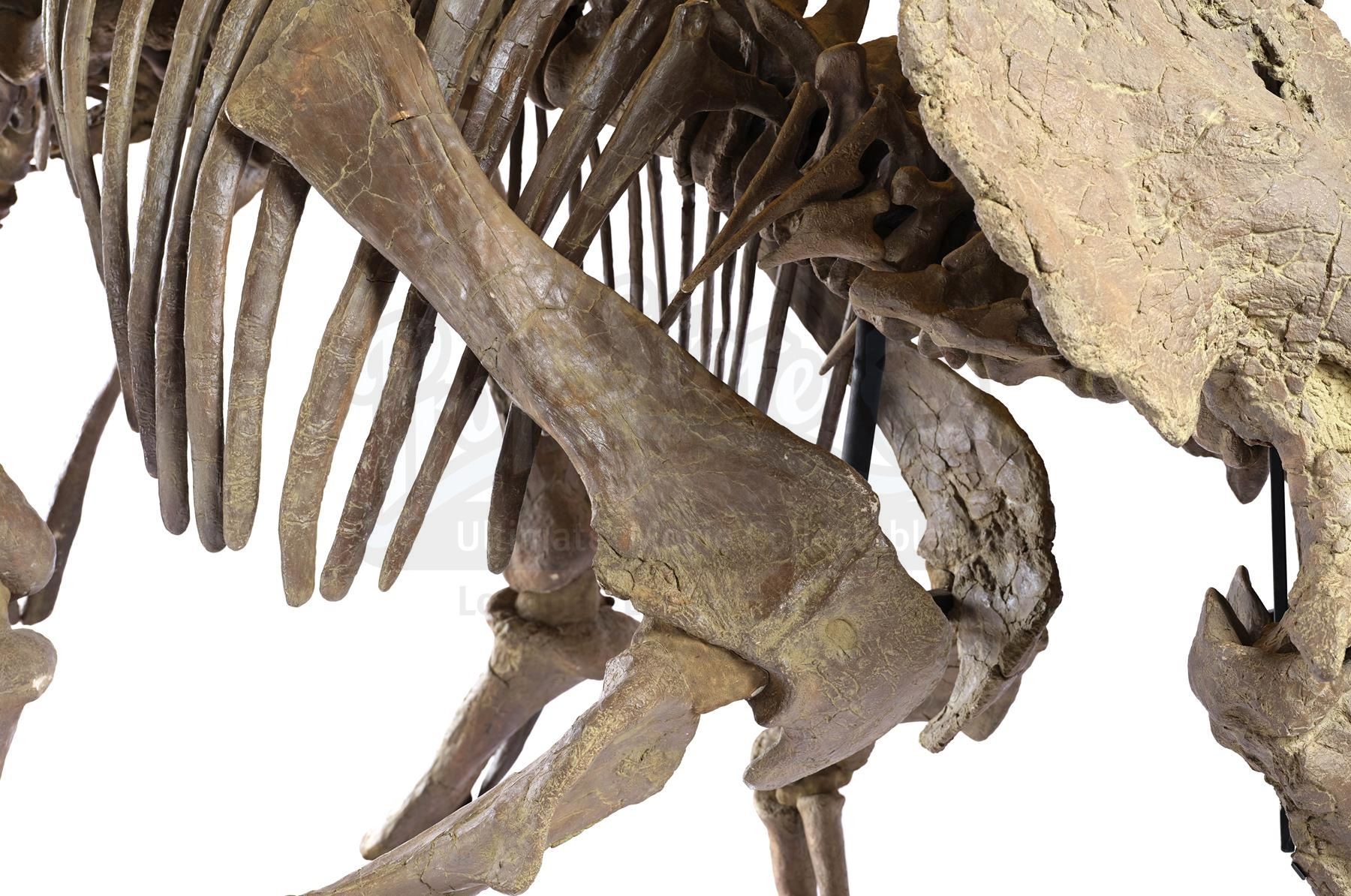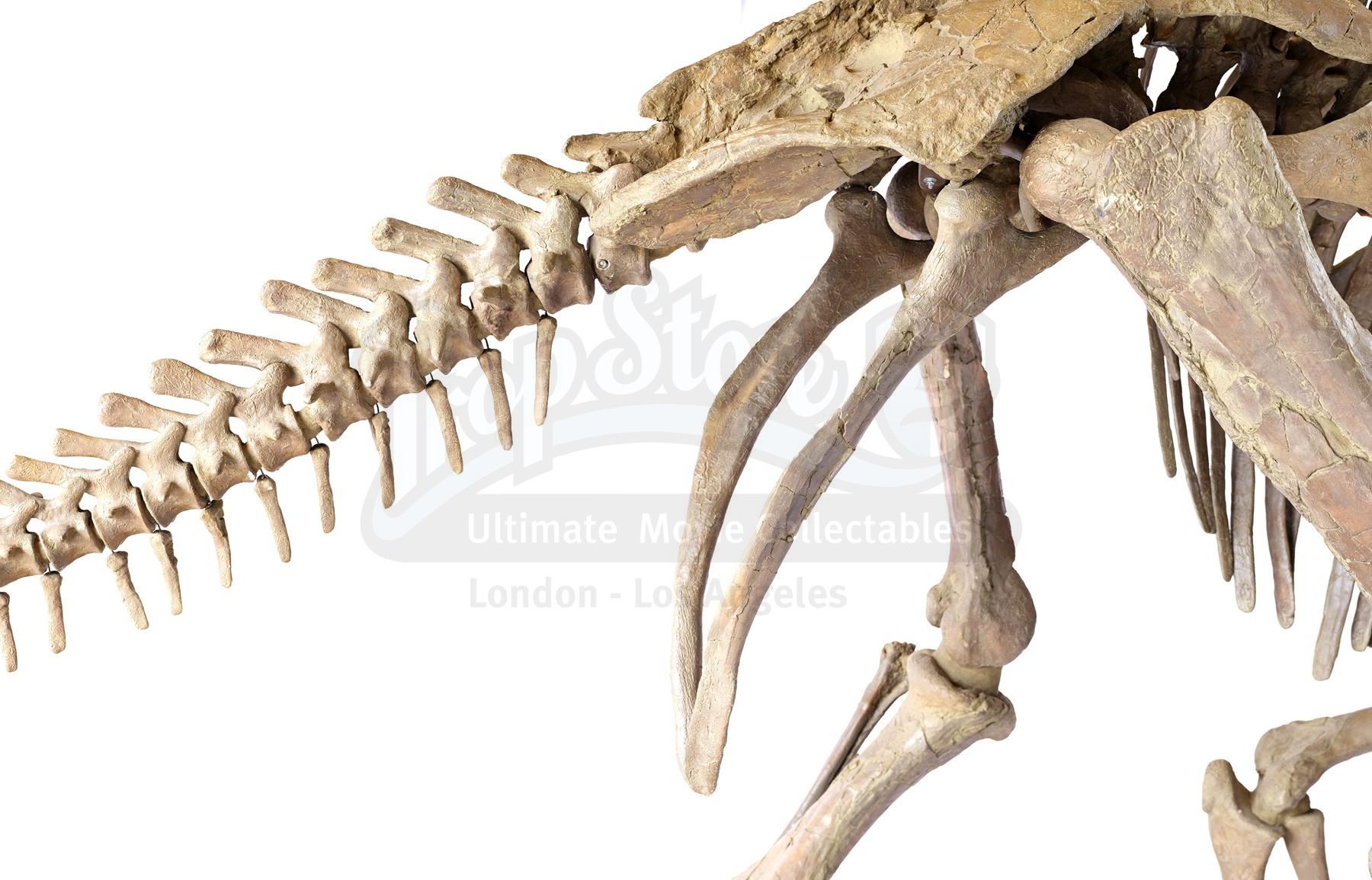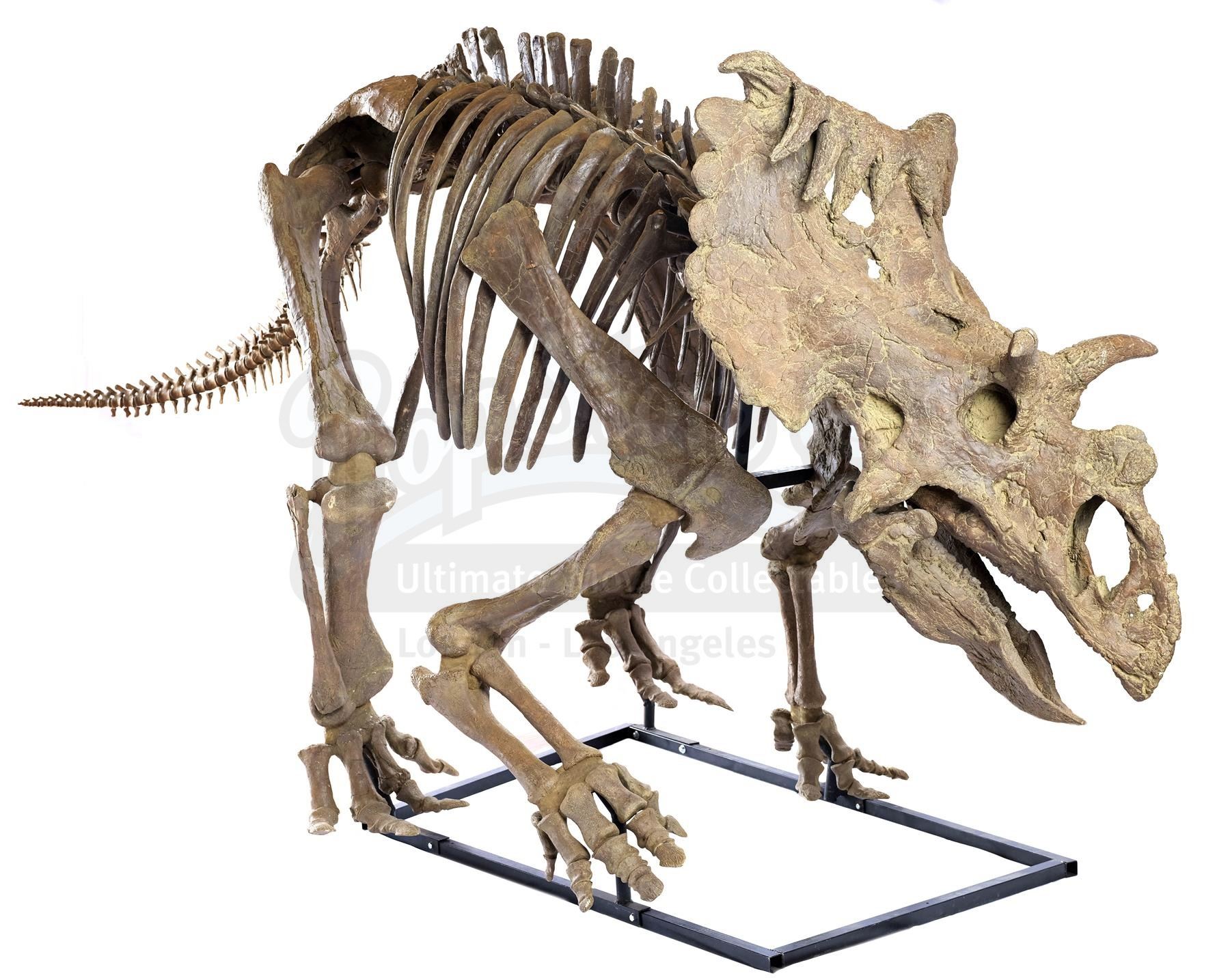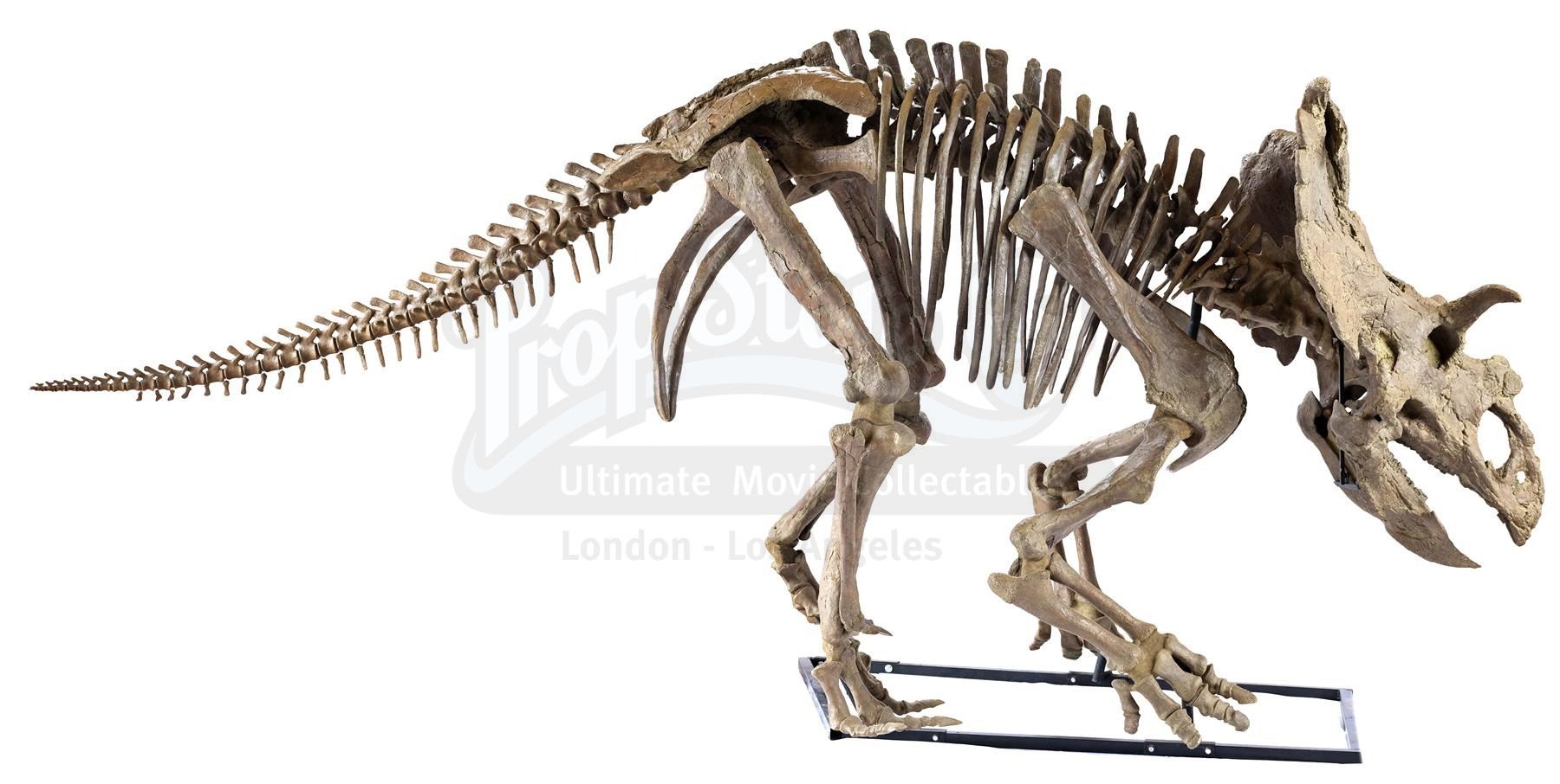 A diorama room 15-foot kosmoceratops skeleton from J.A. Bayona's action-adventure sequel Jurassic World: Fallen Kingdom. Owen Grady (Chris Pratt), Claire Dearing (Bryce Dallas Howard) and Maisie Lockwood (Isabella Sermon) used the dinosaur skeletons in the Lockwood Library as cover to help them evade the Indoraptor hunting them. This particular skeleton is prominently seen by the main entrance of the library.