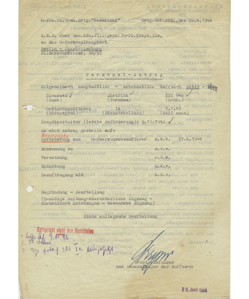 (1901 - 1947) Brigadeführer in the Waffen SS, commander of the 23rd SS Volunteer Panzer Grenadier Division "Nederland", awarded the Knight's Cross with Oak Leaves. War-date D.S. , 2pp. 4to., [on leave in Germany], Apr. 25, 1944 a promotion recommendation for SS-Sturmbannfuhrer Dietrich Ziemssen. Co-signed in pencil at top by FELIX STEINER (1896-1966) Waffen-SS officer He skillfully commanded the SS-Deutschland Regiment through the invasions of Poland, France and the Low Countries, later leading the SS-Division Wiking, III (Germanic) SS Panzer Corps, and 11th SS Panzer-Army. Very good.