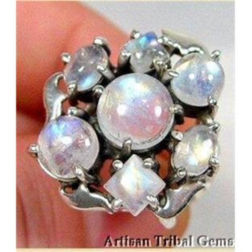 Our gemstone showcase consists of the finest NATURAL gemstones set by hand in elaborate sterling and this ring is no exception.... This Incredible Mass of Rainbow MOONSTONE Ring is of superb quality. Fashioned in exquisite sterling, hallmarked 925, it will quickly become your favorite piece of jewelry. The rainbow moonstone ring has a height of 28mm.(25mm=1") Simply a finely executed design with a very impeccible stones and a very impressive gram weight of 17.2. Definitely heavy guage to last a lifetime. The ring is a size 8.25. (a373)