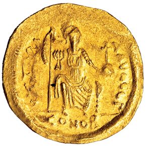 JUSTINO II. Sólido. Constantinopla, G. R/ Constantinopla sentada de frente con cetro y globo crucífero, VICTORIA AVGGG. SBB-344. R.B.O. EBC-.
