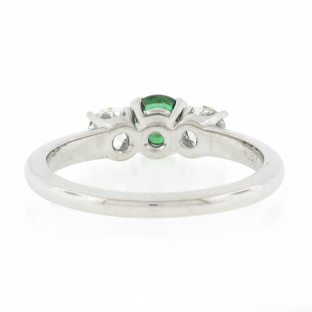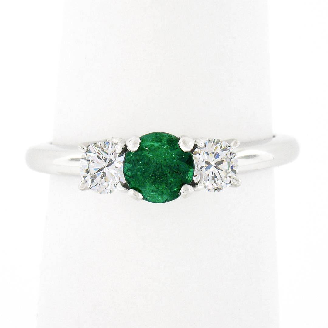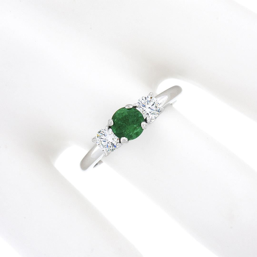 A solid 18k white gold 3 stones ring by Jabal, with 1 round brilliant cut natural emerald (5mm / 0.50ct), and 2 round brilliant cut natural diamonds (F/G - VS1/VS2 ; 0.42ctw). The ring is size 6.5, weighs a total of 3.56 grams, and measures 5mm wide.