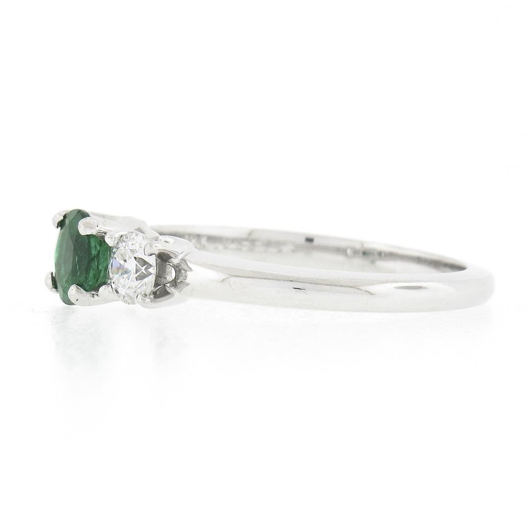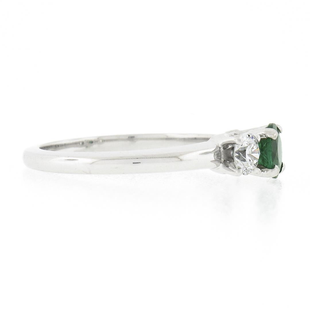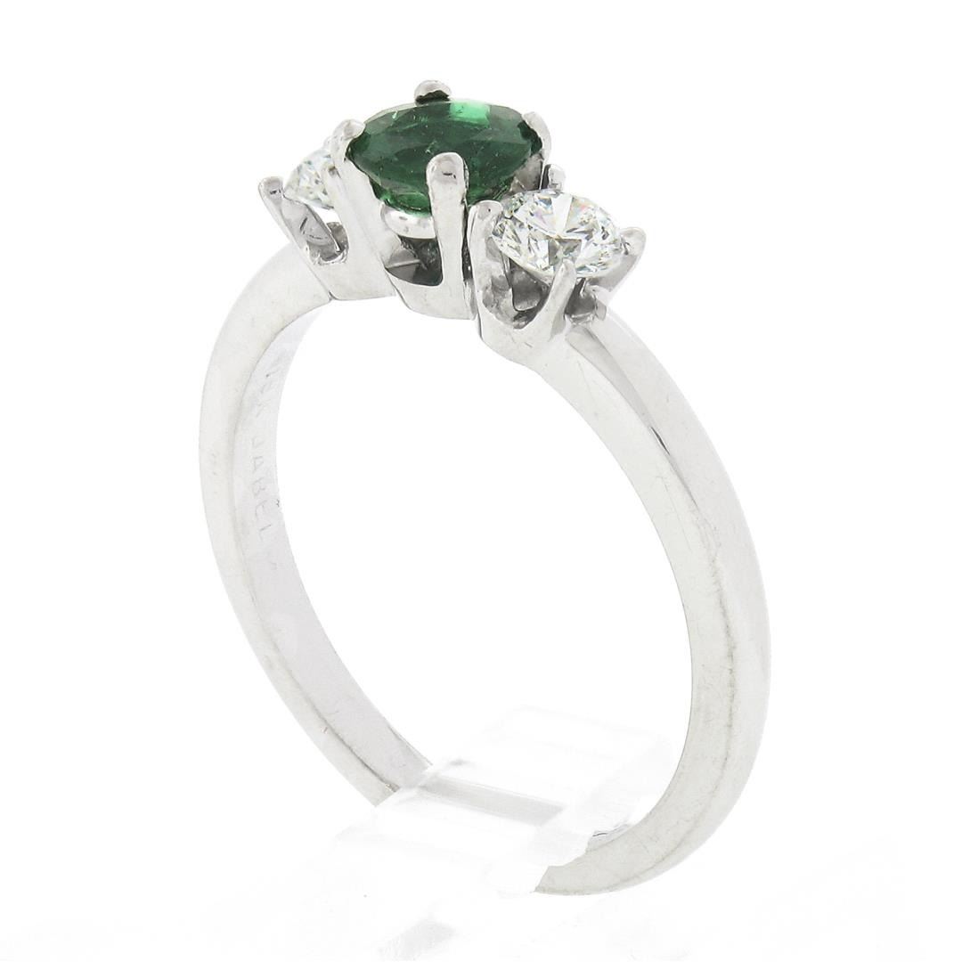 A solid 18k white gold 3 stones ring by Jabal, with 1 round brilliant cut natural emerald (5mm / 0.50ct), and 2 round brilliant cut natural diamonds (F/G - VS1/VS2 ; 0.42ctw). The ring is size 6.5, weighs a total of 3.56 grams, and measures 5mm wide.