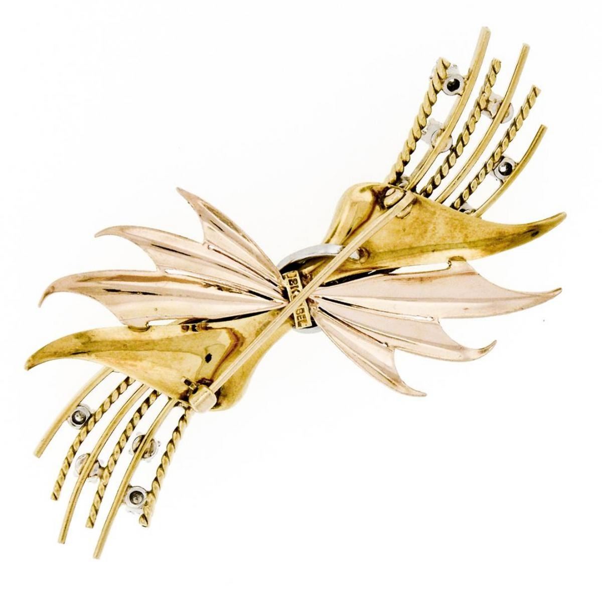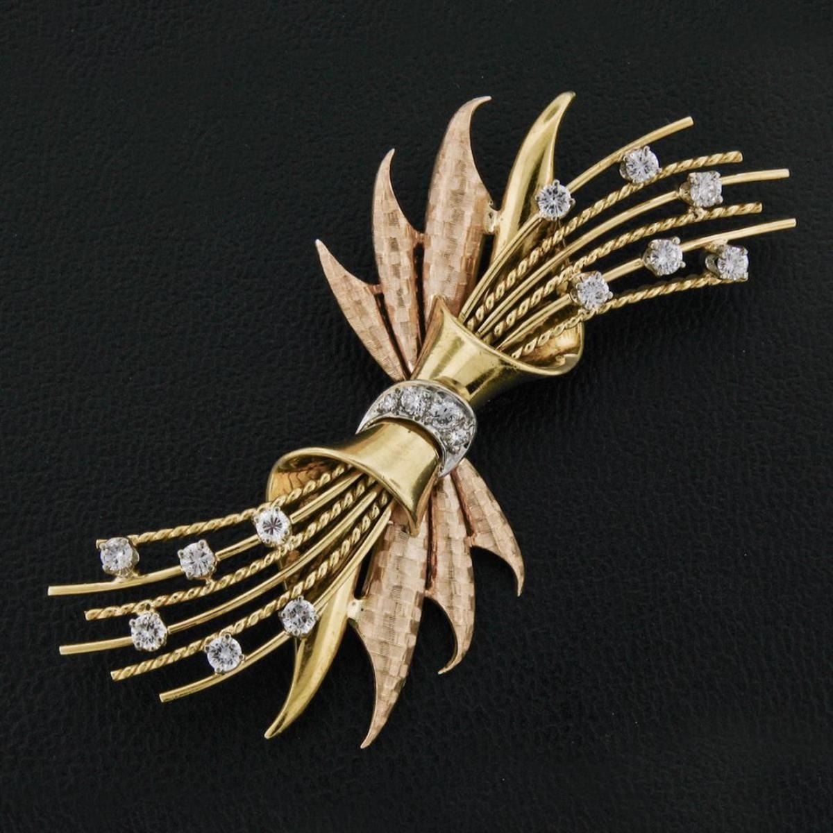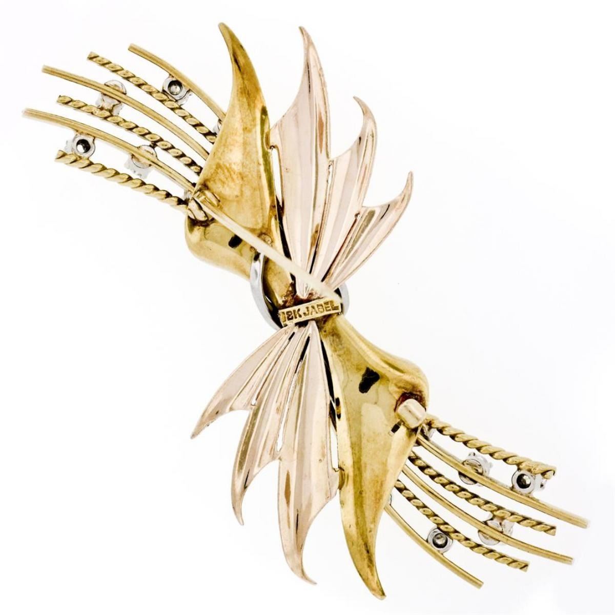 Jabel Vintage 18K Gold .90ct Diamond Textured Multi-Wire Spray Bow Brooch Pin. A vintage solid 18k tri-color gold brooch made in the United States by Jabel featuring 16 round brilliant cut natural diamonds (F/G - VVS2/VS1; 0.90ctw). Measures 33.75x14.50mm and weighs a total of 15.78 grams.