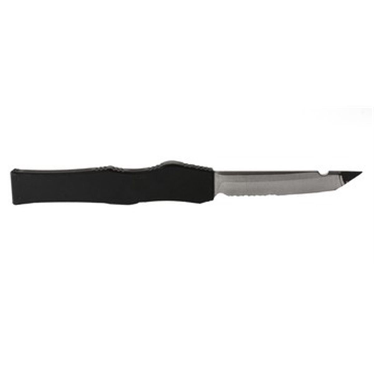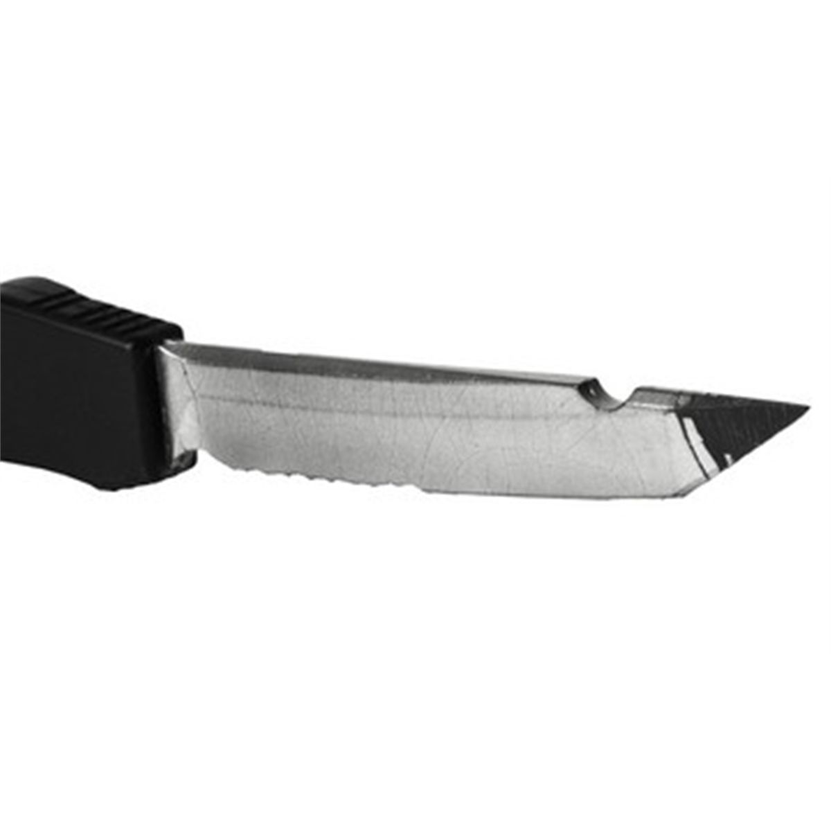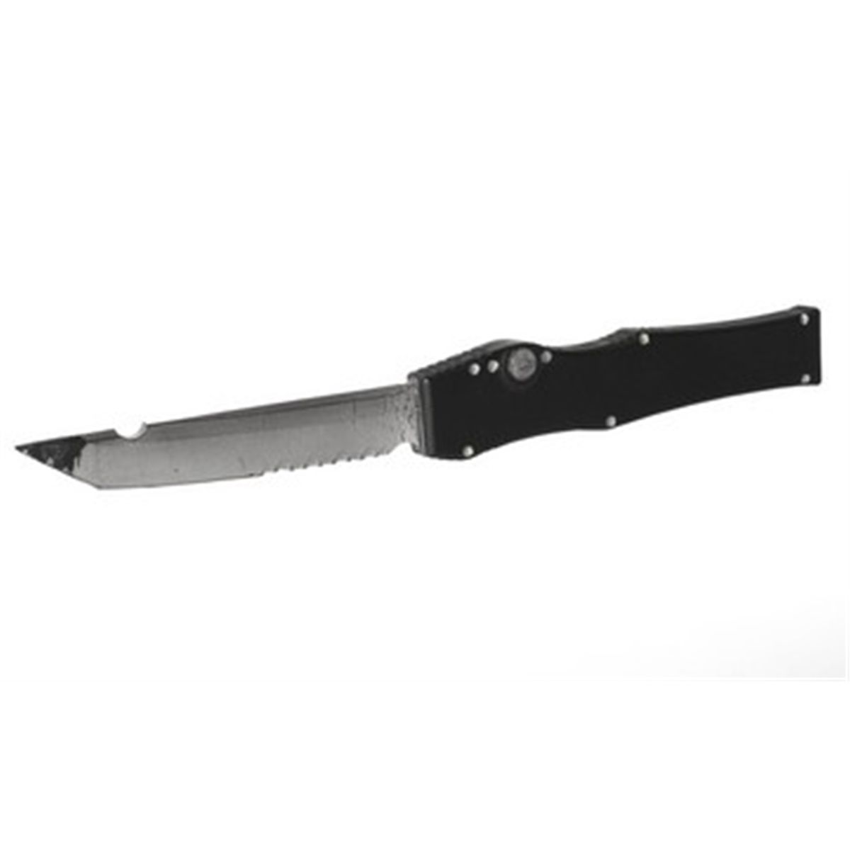 This prop knife was used by the character "Jack Bauer," portrayed by actor Kiefer Sutherland, in the iconic television series "24." The prop weapon is constructed of black rubber with hand painted silver details and is modeled after a Microtech Halo III automatic knife with partially serrated tanto point blade. This knife was a signature weapon used by Jack Bauer in pivotal scenes from Seasons One, Four, and Five of the series.