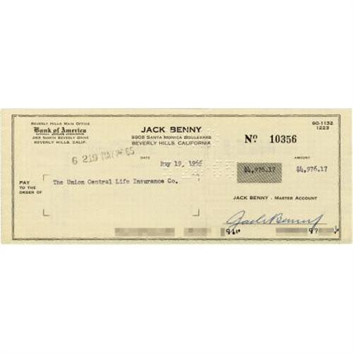 <B>Jack Benny Signed Check.</B></I> Personal check for $4,976.17, dated May 28, 1965 and signed by Benny in blue ballpoint. In Very Fine condition with a fold crease and the usual bank cancellation marks.<BR><BR><b>Shipping:</b> Flat Material, Small (<a target="_blank" href="http://www.heritageauctions.com/common/shipping.php">view shipping information</a>)