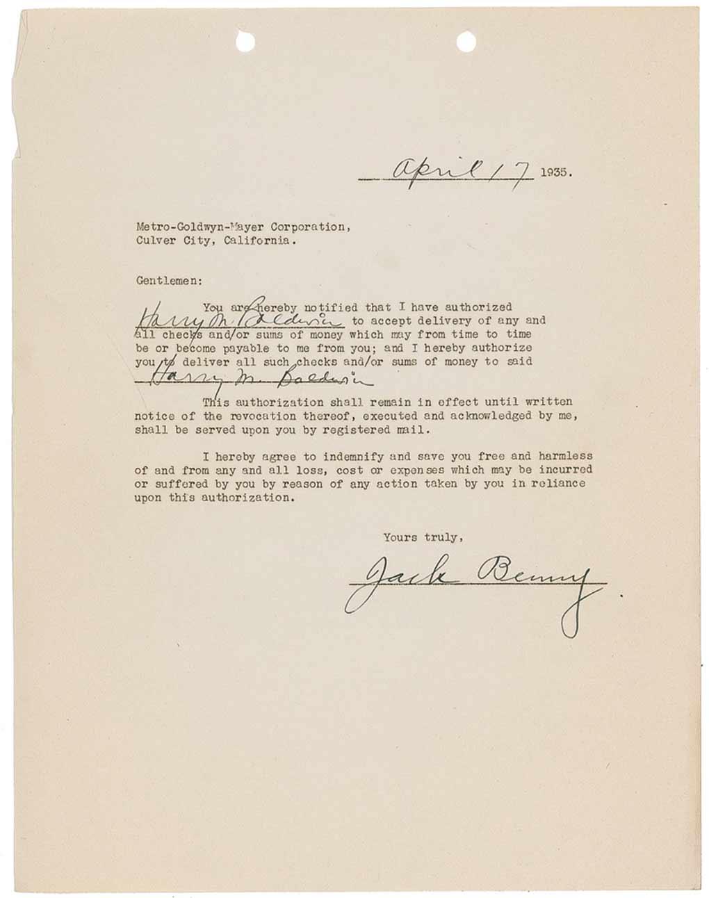 DS, one page, 8.5 x 11, April 17, 1935. Benny authorizes Harry Baldwin to accept delivery on any and all checks payable to him from MGM. Signed at the conclusion in black ink by Benny. In fine condition, with light overall toning, a few creases, and punch holes to top edge.