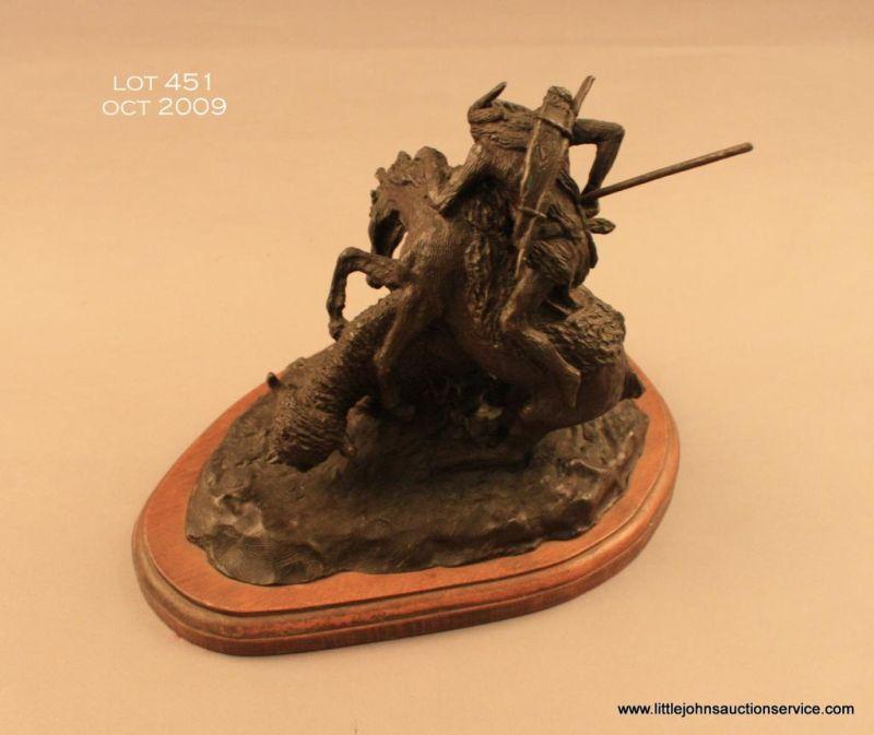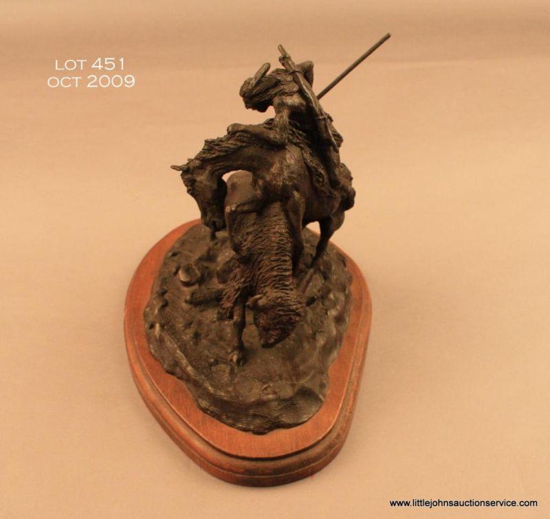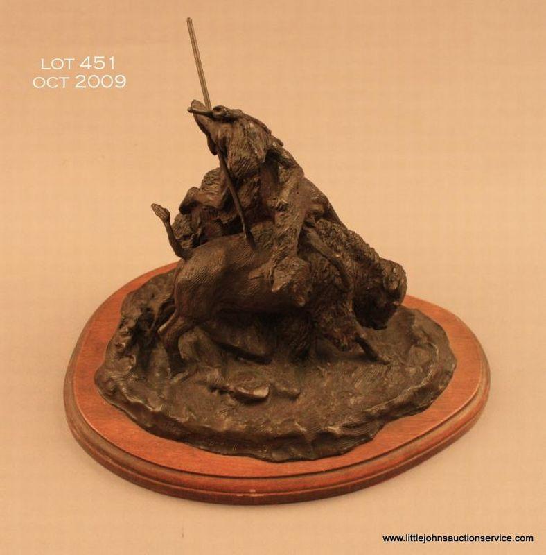 Jack Bryant 1 of 10 bronze of an Indian on horseback lancing a buffalo, approx. 7” high, 11” long and 6” wide, in overall excellent condition showing lots of action. Est.: $1,000-$1,800.