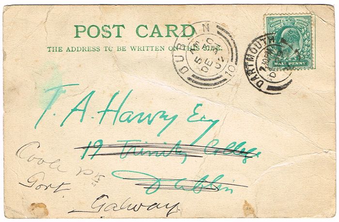 image inscribed and signed in monogram lower right; postmarked [Dartmouth / 7.30pm Dec 29 / 02]; addressed to T.A. Harvey Esq., [19 Trinity College, Dublin (scratched out) Coole Park, Gort, Galway]