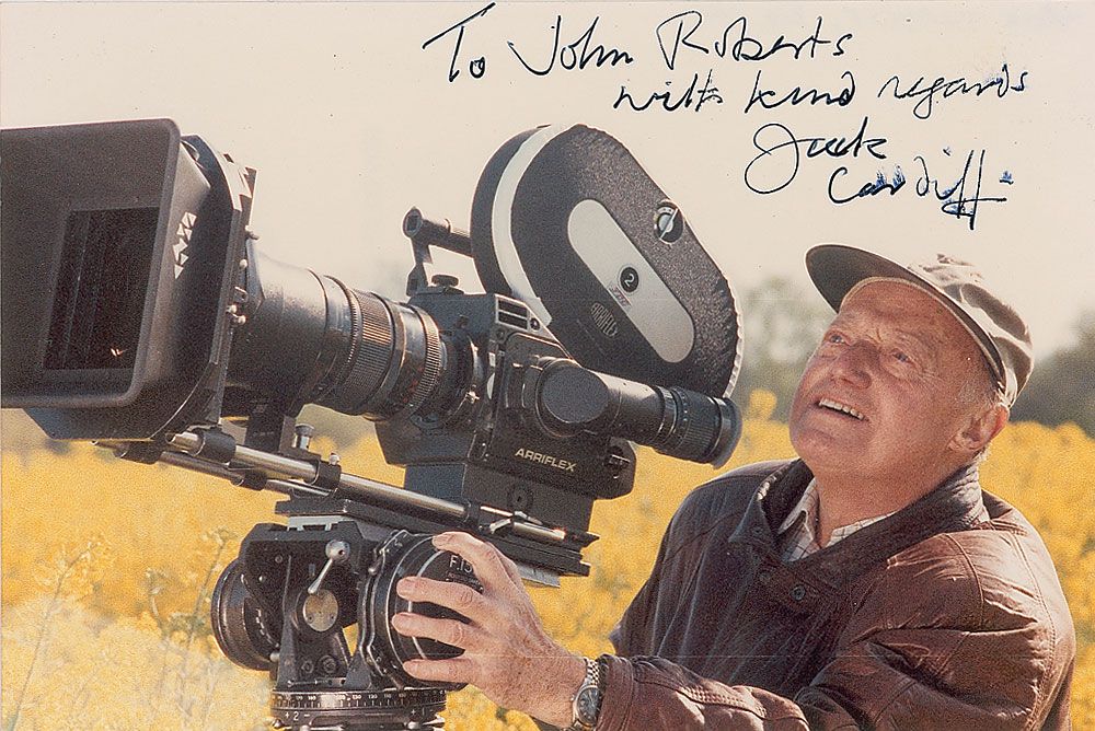 Academy Award–winning cinematographer and director (1914–2009). Color glossy 6 x 4 photo of Cardiff behind a camera, signed and inscribed in fountain pen, “To John Roberts, with kind regards, Jack Cardiff.” In fine condition, with some brushing to signature.