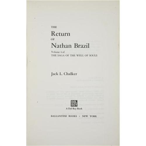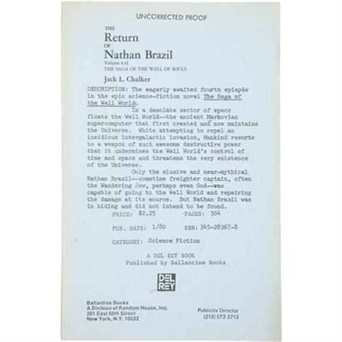 <B>Jack L. Chalker. Uncorrected Proof of </B></I><B><I>The Return of Nathan Brazil</B></I></B></I>. New York: Ballantine Books, 1980. <BR>Uncorrected proof. Octavo. 258 pages. <BR><BR>Paper covers. Includes reviewer's memo from the editors at Del Rey/Ballantine Books. Overall near fine with some fading on spine and covers. Jack L. Chalker (1944-2005) is best known for his popular "Well of Souls" series of novels, of which <I>Nathan Brazil</B></I> is number four. Following his death at age 60, Chalker was cremated and his ashes were distributed among several locations, including H. P. Lovecraft's grave. <I>From the Robert and Diane Yaspan Collection.</B></I><BR><BR><b>Shipping:</b> Books & Catalogs (<a target="_blank" href="http://www.heritageauctions.com/common/shipping.php">view shipping information</a>)
