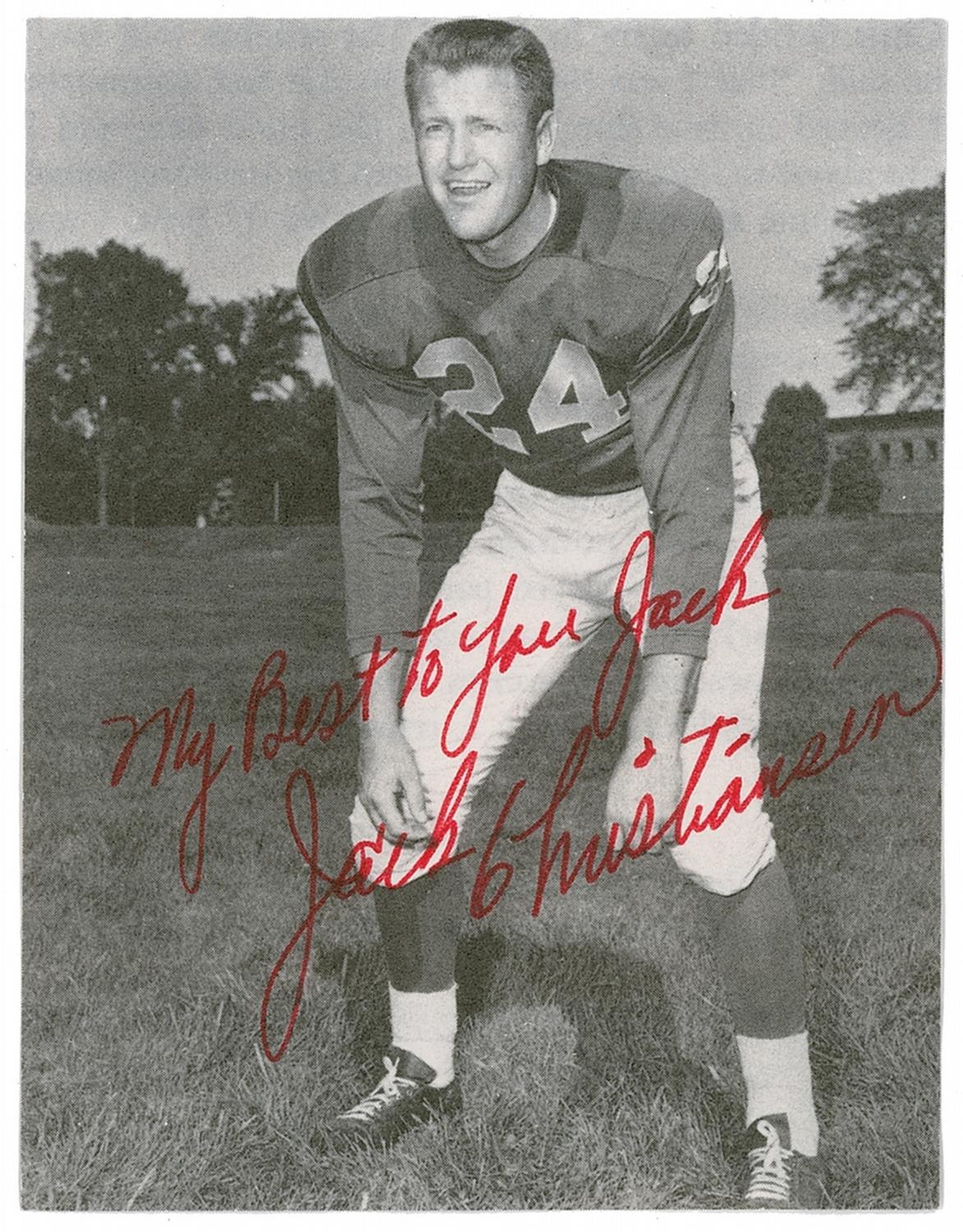 Pro Football Hall of Famer (1928–1966) who died of cancer at the age of 57. Attractive 3.25 x 4.25 paperstock photo clipped from a publication, signed and inscribed in red ink “My best to you Jack. Jack Christiansen.” In fine condition with a James Spence Authentication label affixed to the reverse and accompanied by a certificate of authenticity from JSA.