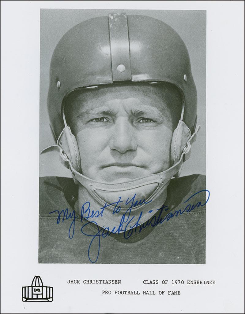 Pro Football Hall of Famer (1928–1966) who died of cancer at the age of 57. Glossy 8 x 10 Hall of Fame Induction photo, signed in blue felt tip, “My best to you, John Christiansen.” In fine condition.