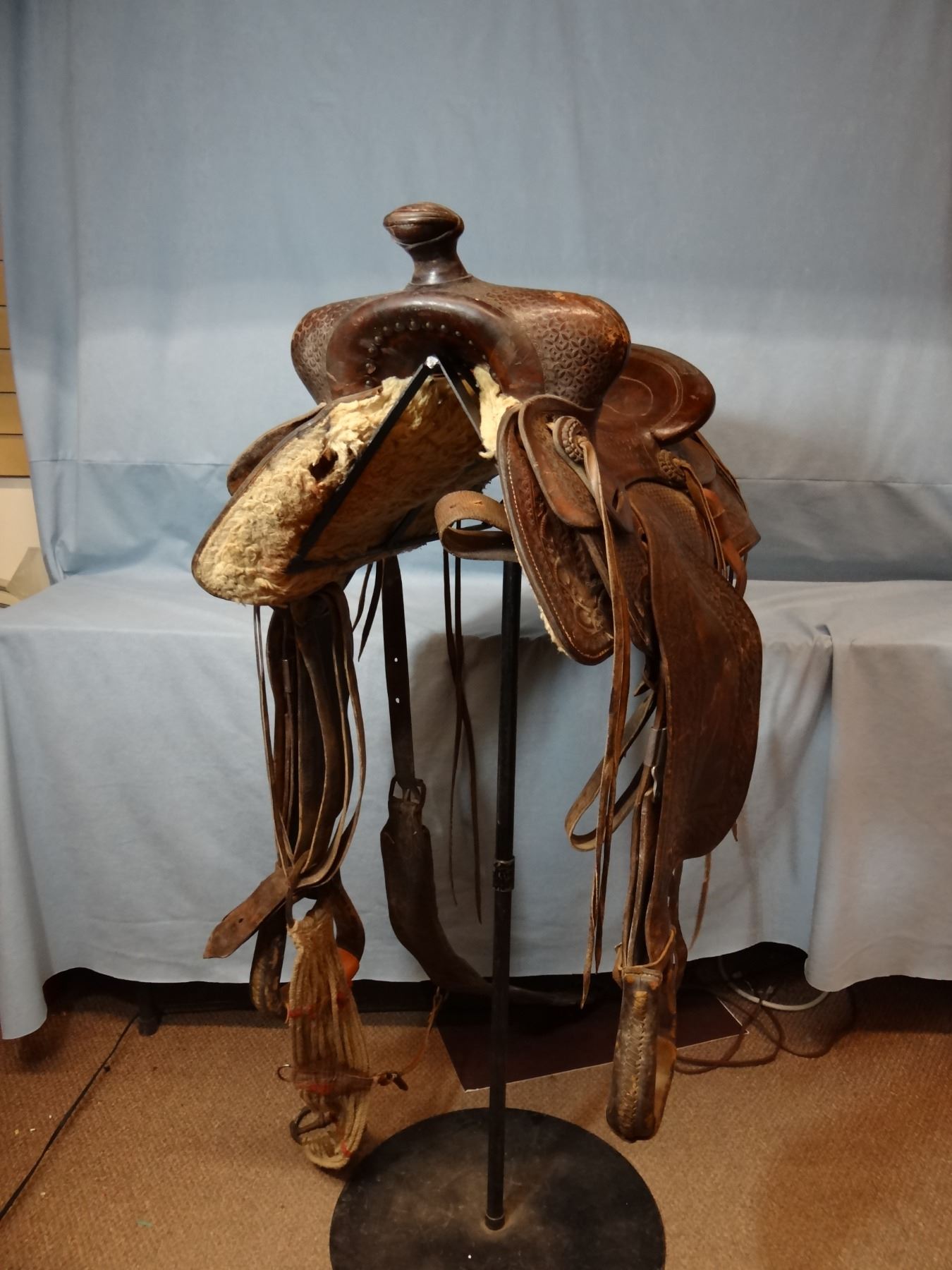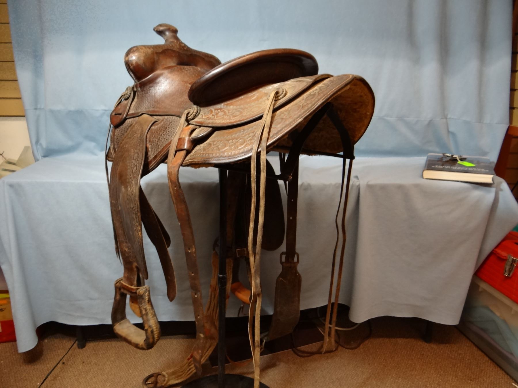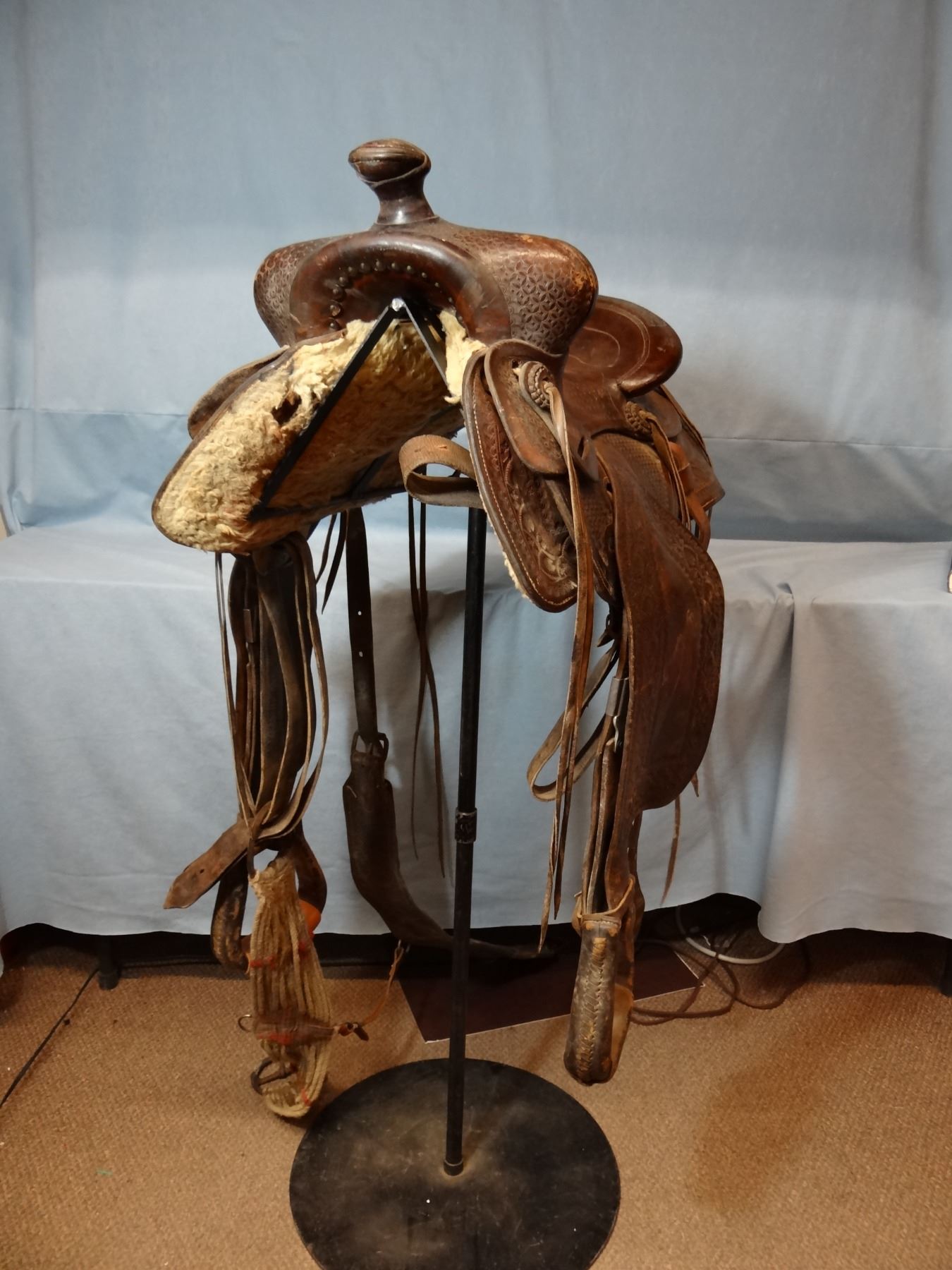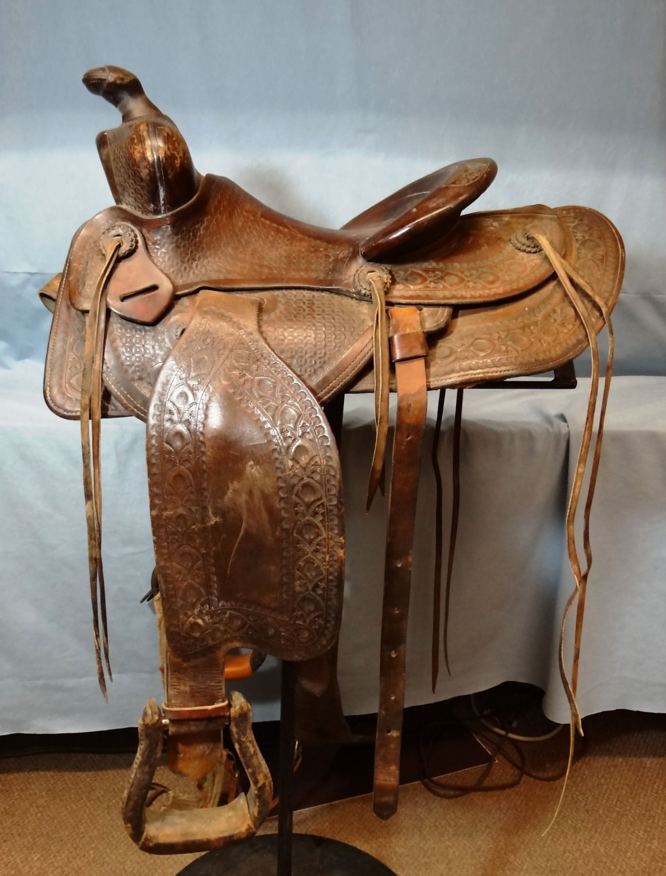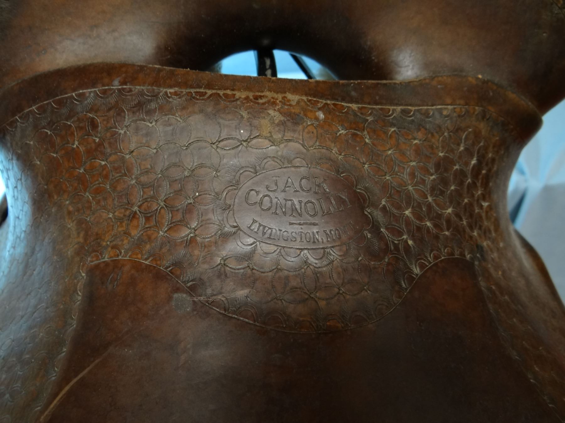 Jack Connolly saddle, 13 1/2", basket stamped, dble rigged, Blevins style stirrup adjusters, round skirts, made in Livingston, MT.