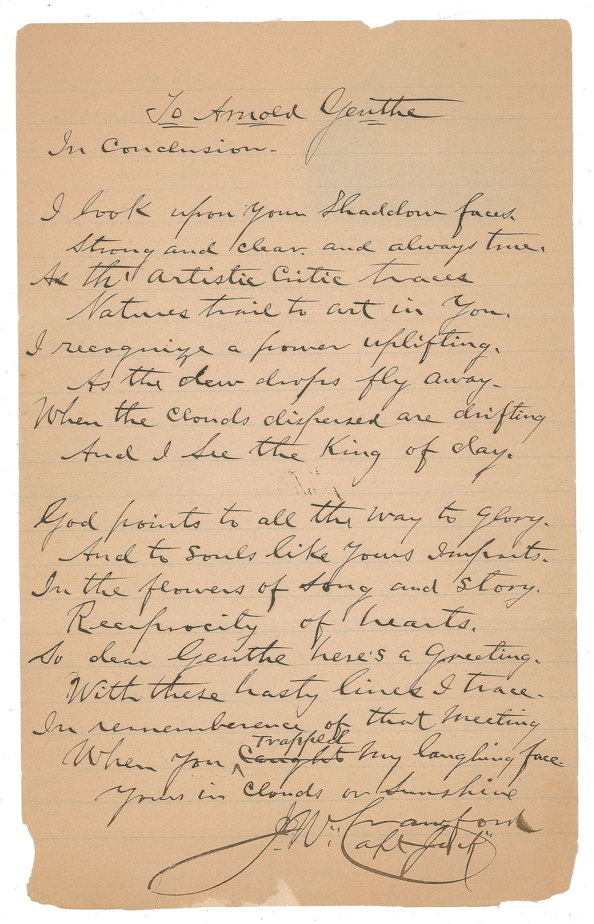 Handwritten poem by Jack Crawford, penned on the reverse of a 5.75 x 9.25 sheet of The New Hoffman House stationery, no date, signed at the conclusion: "J. W. Crawford, 'Capt. Jack.'" The poem, which is entitled "In Conclusion" and inscribed to noted German-American photographer "Arnold Genthe," reads in full: "I look upon your Shaddow faces, Strong and clear and always true / As the artistic critic traces, Natures trail to art in you. / I recognize a power uplifting, As the dew drops fly away / When the clouds dispersed are drifting, And I see the king of day. / God points to all the way to glory, And to souls like yours imparts / In the flowers of song and story, Reciprocity of hearts / So dear Genthe here's a greeting, With these hasty lines I trace / In remembrance of that meeting, When you trapped my laughing face, Yours in clouds or sunshine." In very good to fine condition, with chipping to the edges, and two old tape repairs on the back.