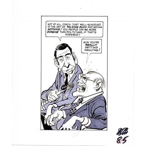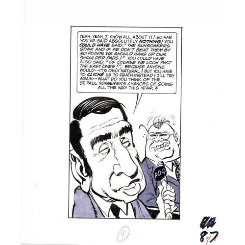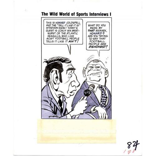 <B>Jack Davis - "A Mad Guide to Sports" Complete 15-page Story "The Wild World of Sports Interviews I and II" Original Art (circa 1975).</B></I> Sports journalist "Howard Coldspell" conducts two hard-hitting interviews that "tell it like it is" in two outrageous stories, drawn by Jack Davis for a <B>Mad</B></I> paperback. "Interview I" is eight pages long, while "Interview II" is seven. Davis' caricatures of Howard Cosell are nothing short of a laugh-riot! Each panel of these stories represented a full page in the paperback. There are fifteen panels on fifteen pages. Each panel has an image area of 5.25" x 9", and the art is in Excellent condition.
