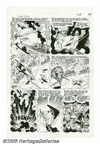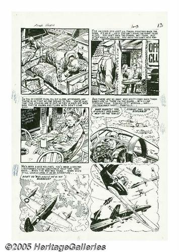 <B>Jack Davis - Aces High #5 pages 13 and 14 Original Art (EC, 1955).</B></I> These two outstanding aerial pages are from the story "Iron Man!" and feature not only a spectacular dogfight sequence but the moral angst of a survivor, and a couple of rare "silent" panels (with no lettering or sound effects), a bit of an oddity for the usually text-heavy EC. The legendary Jack Davis renders these wartime thrills with his usual precision, pumping vitality into the page like a blood transfusion. The image area measures 13" x 19.5" and the art is in Excellent condition.