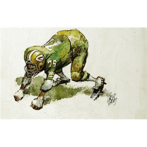 <B>Jack Davis - Green Bay Packer Painting Original Art (undated).</B></I> Jack Davis is one of the best sports cartoonist-illustrators of the modern era. In this painting, Davis' Green Bay lineman wears number 75, the number of Hall-of-Fame offensive lineman Forrest Gregg. Coach Vince Lombardi said "Forrest Gregg is the finest player I ever coached." To paraphrase Coach Lombardi, "Bidding isn't the most important thing -- it's the <I>only</B></I> thing." This painting has an image area of 12.5" x 8", and the art is in Excellent condition.