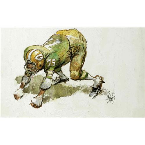 <B>Jack Davis - Green Bay Packer Painting Original Art (undated).</B></I> Jack Davis is one of the best sports cartoonist-illustrators of the modern era. In this painting, Davis' Green Bay lineman wears number 75, the number of Hall-of-Fame offensive lineman Forrest Gregg. Coach Vince Lombardi said "Forrest Gregg is the finest player I ever coached." To paraphrase Coach Lombardi, "Bidding isn't the most important thing -- it's the <I>only</B></I> thing." This painting has an image area of 12.5" x 8", and the art is in Excellent condition.